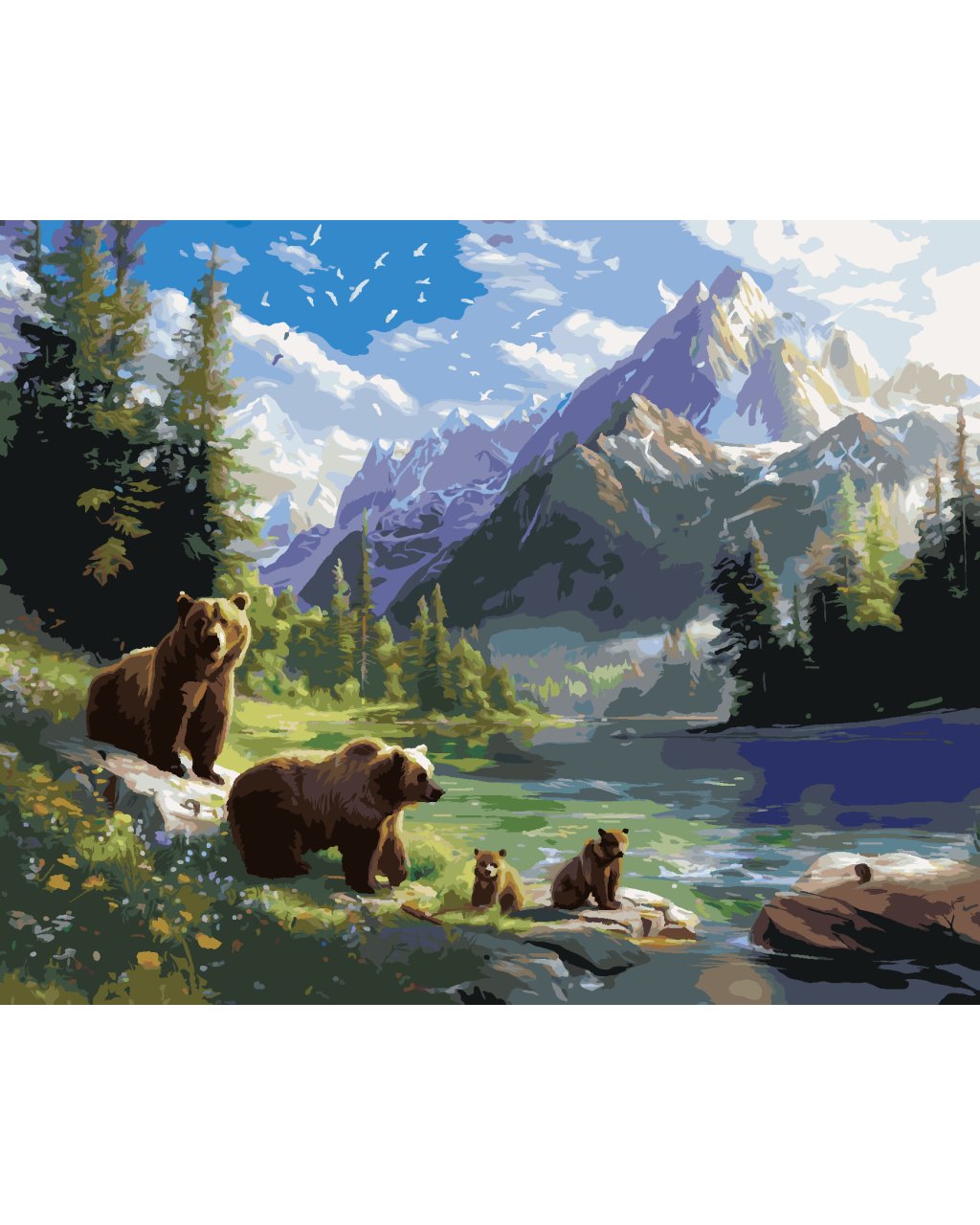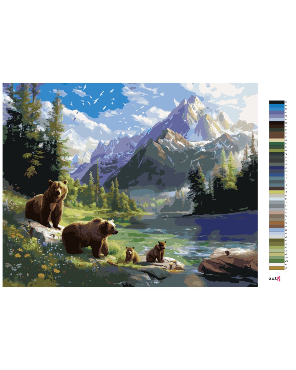 Maľovanie podľa čísel - MEDVEĎ S MLÁĎATAMI, JAZERO A HORY