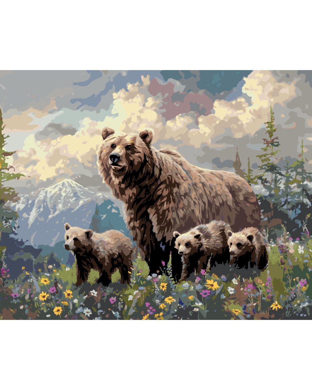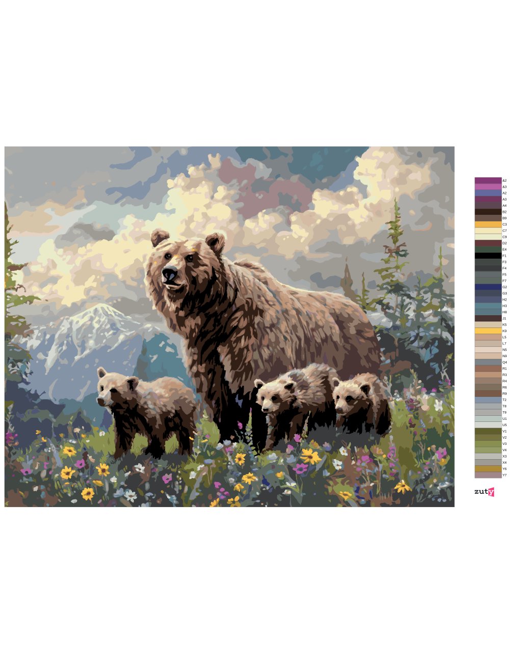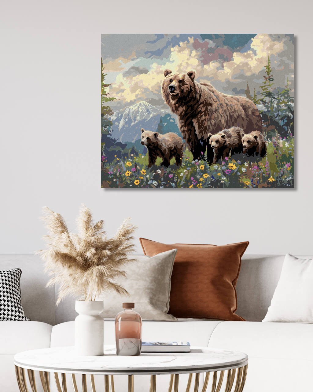 Maľovanie podľa čísel - MEDVEĎ S MLÁĎATAMI V KVETOCH A HORY