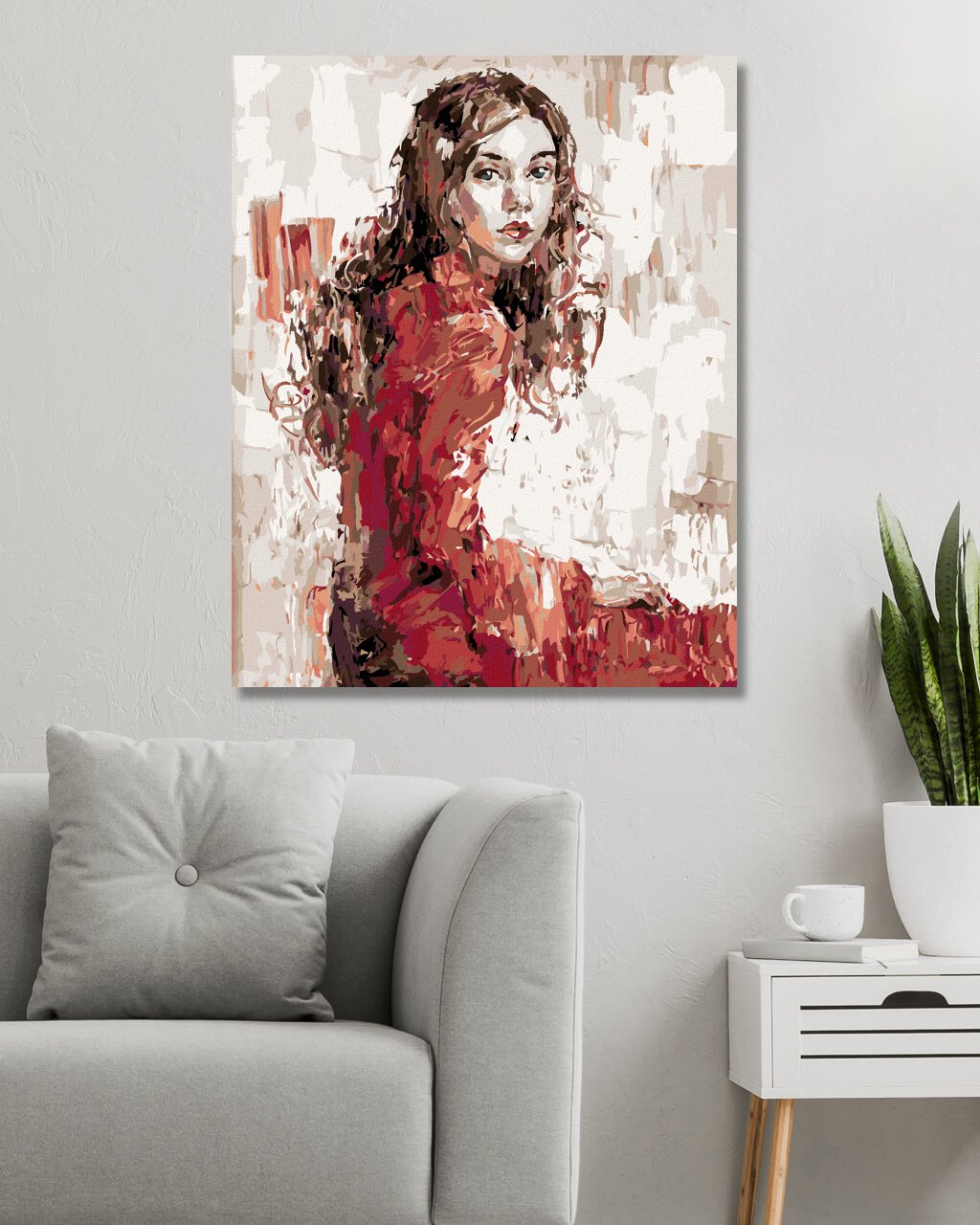 Maľovanie podľa čísel - MLADÁ ŽENA V ČERVENÝCH ŠATÁCH