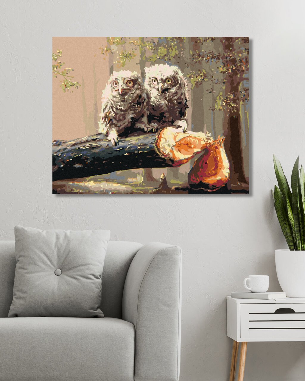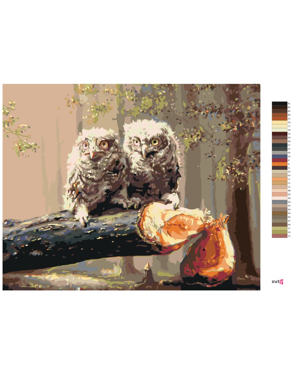 Maľovanie podľa čísel - MLÁĎATÁ SOVY NA ZRÚBANOM STROME (D. RUSTY RUST)