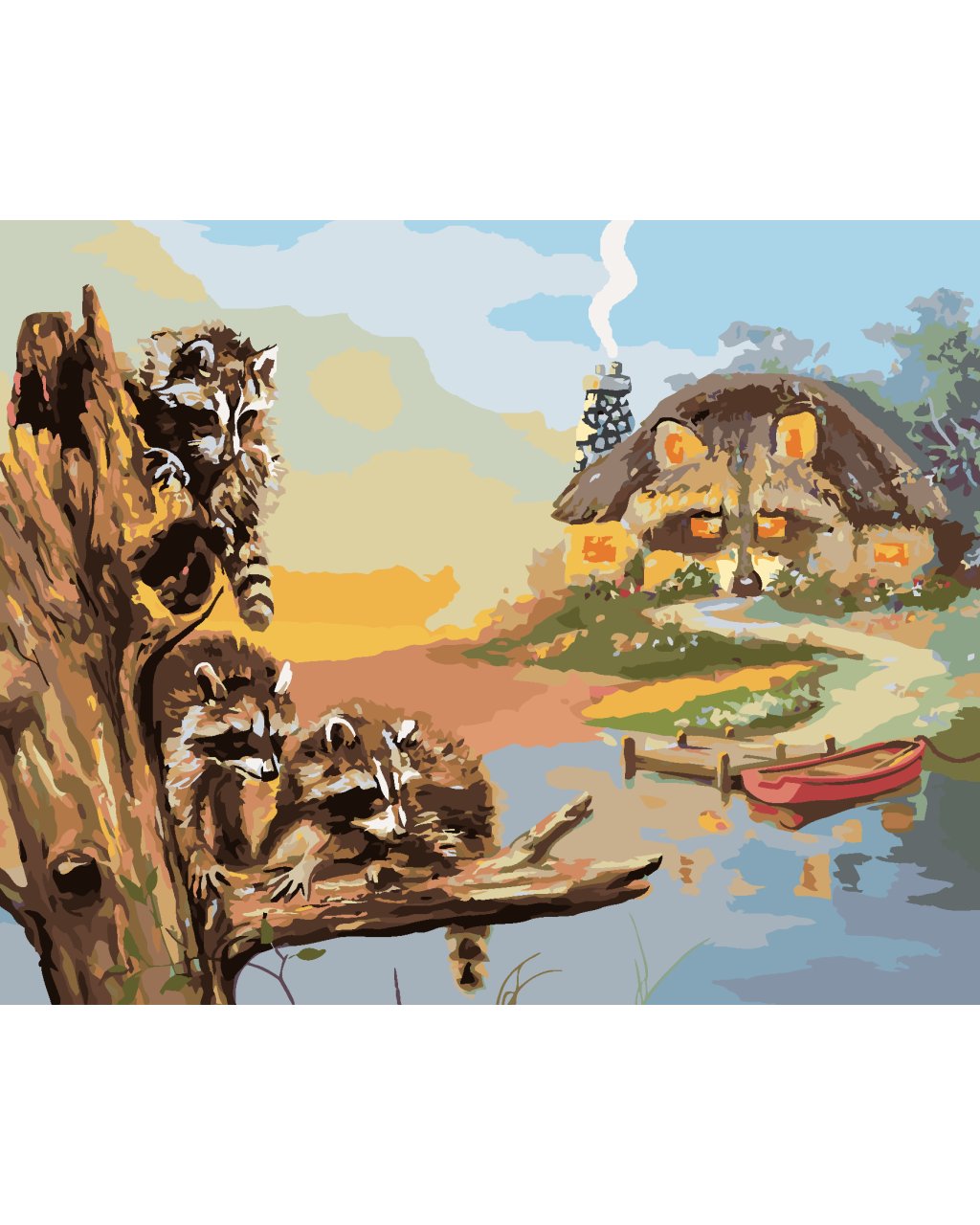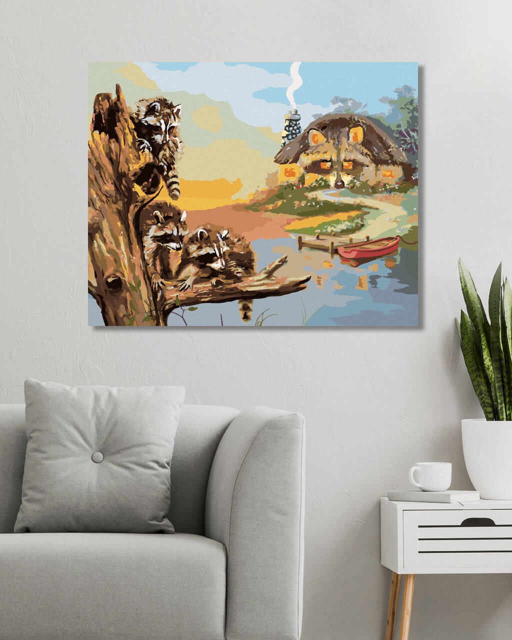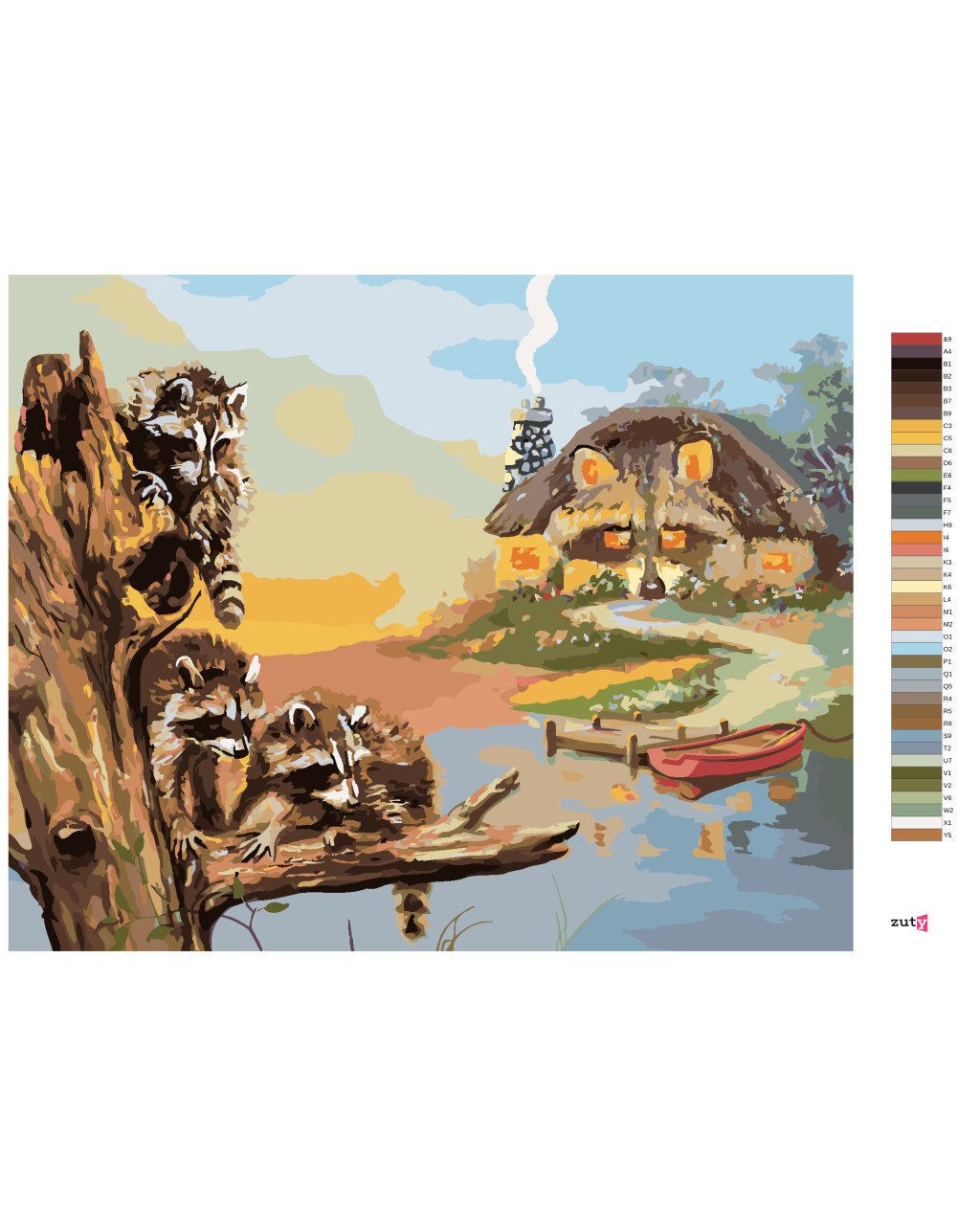 Maľovanie podľa čísel - MÝVAL NA BRVNE, MÓLO S LOĎKOU A CHATA (D. RUSTY RUST)
