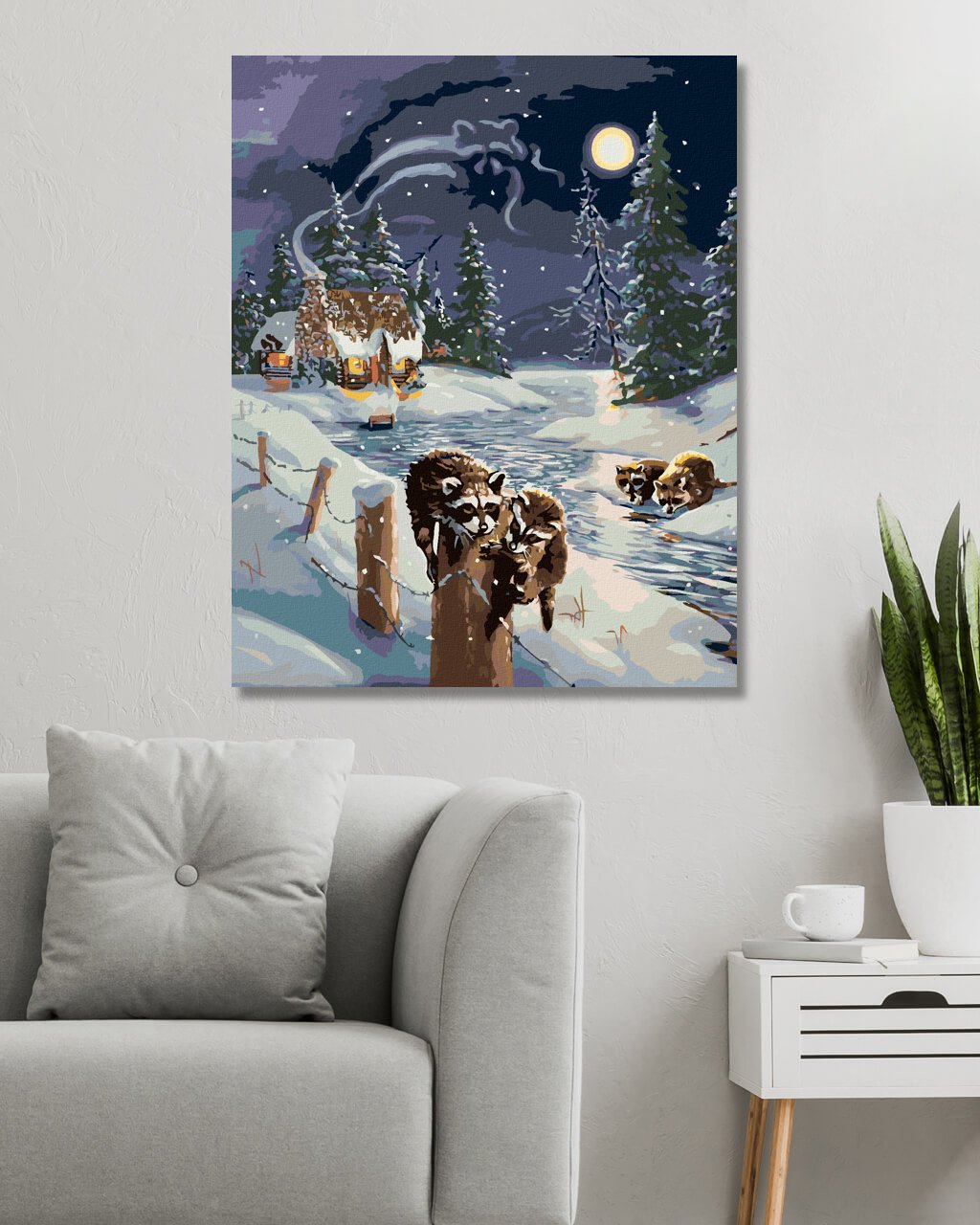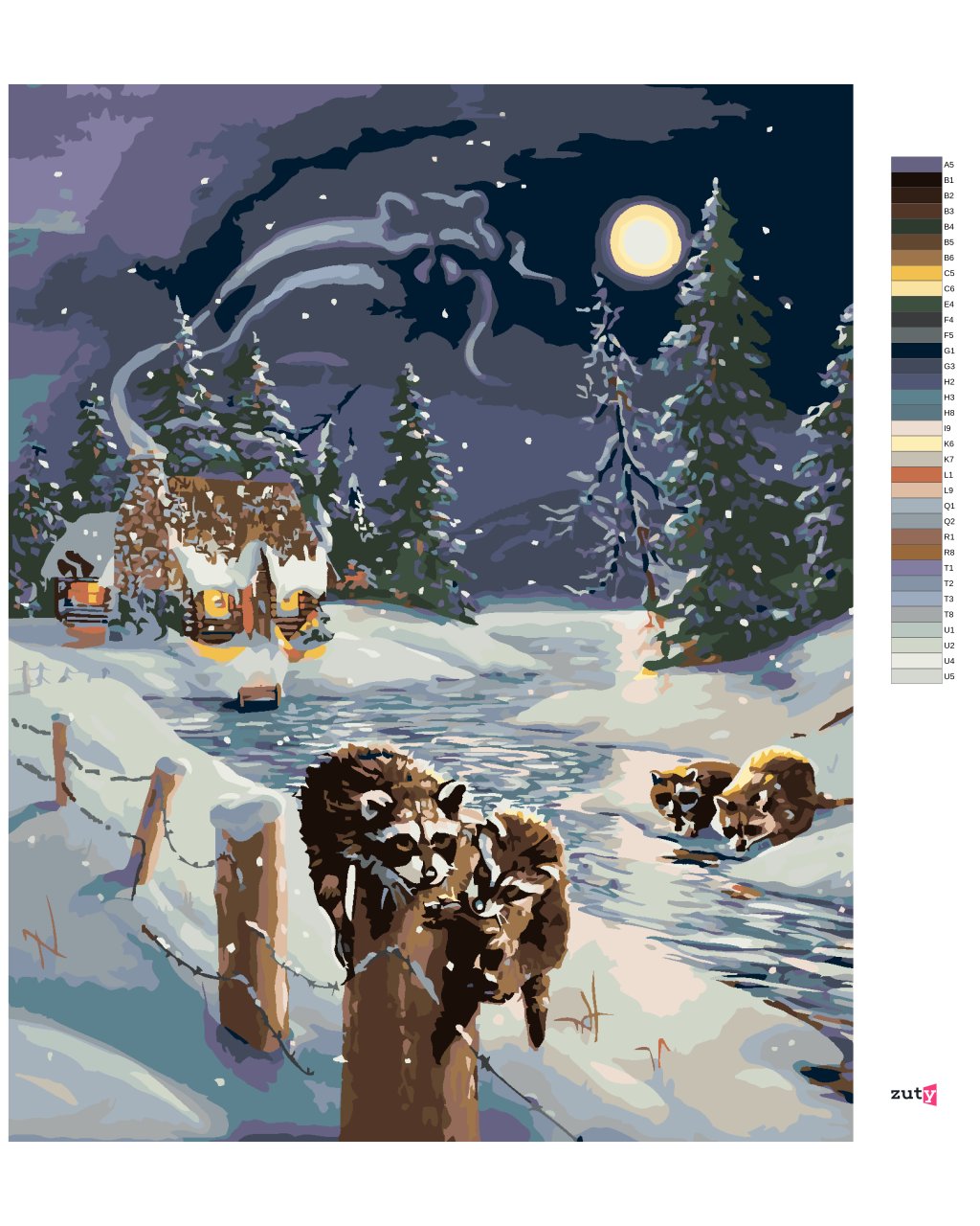 Maľovanie podľa čísel - MÝVAL PRI RIKE A CHATE V ZIMNOM OBDOBÍ (D. RUSTY RUST)