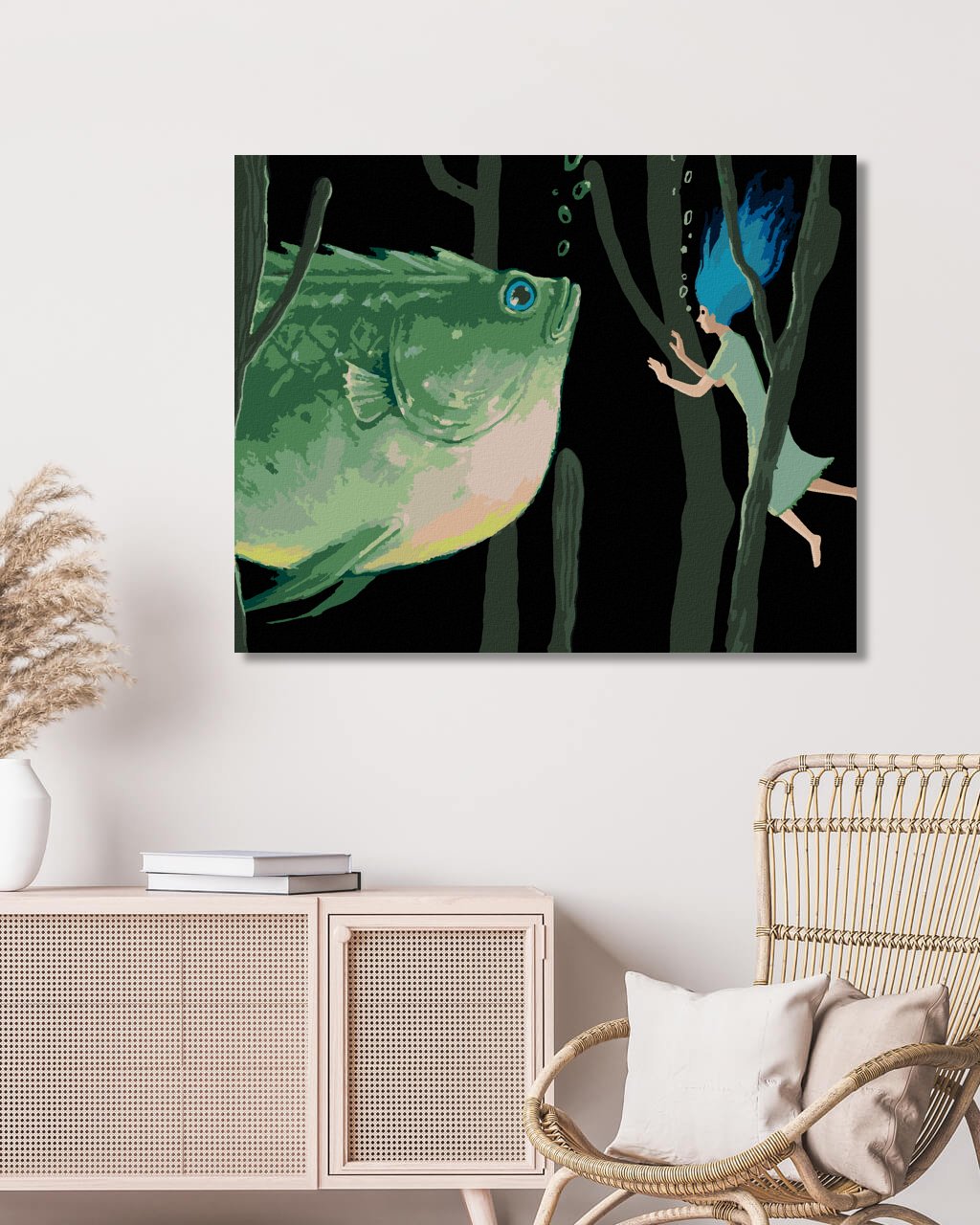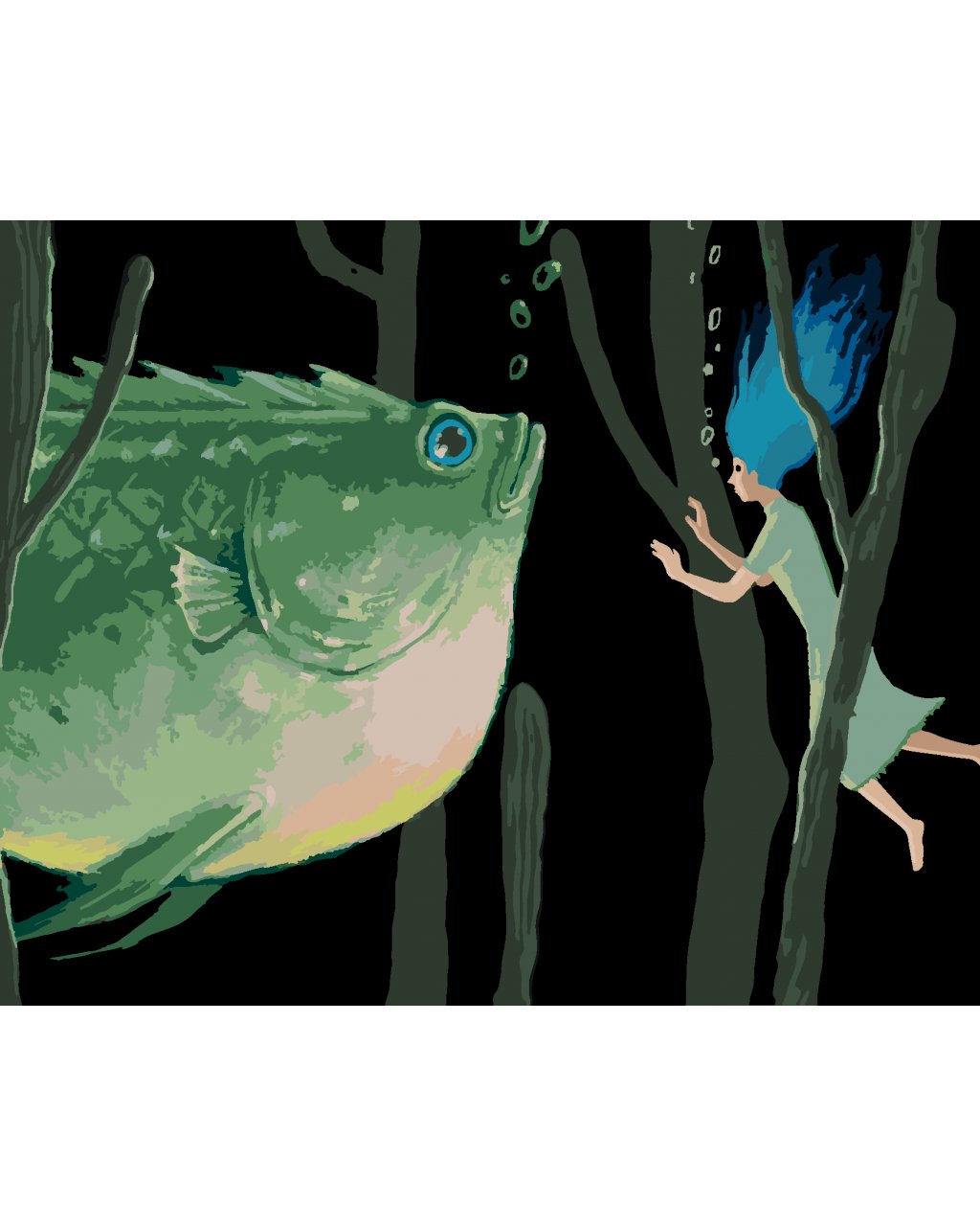 Maľovanie podľa čísel - OBROVSKÁ ZELENÁ RYBA SO ŽENOU
