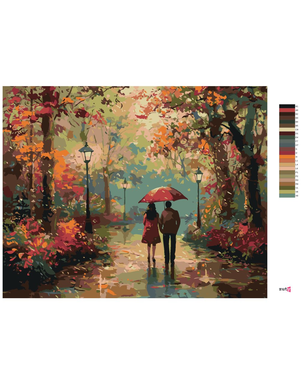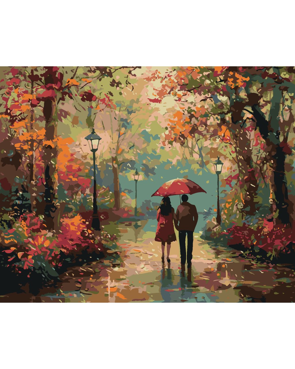 Maľovanie podľa čísel - PÁR POD DÁŽDNIKOM PO DAŽDI A JESENNÝ PARK
