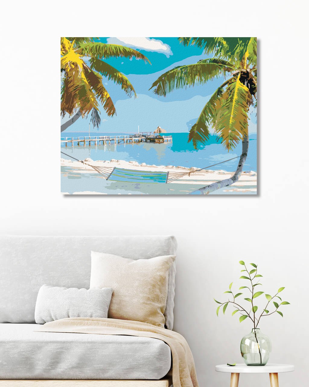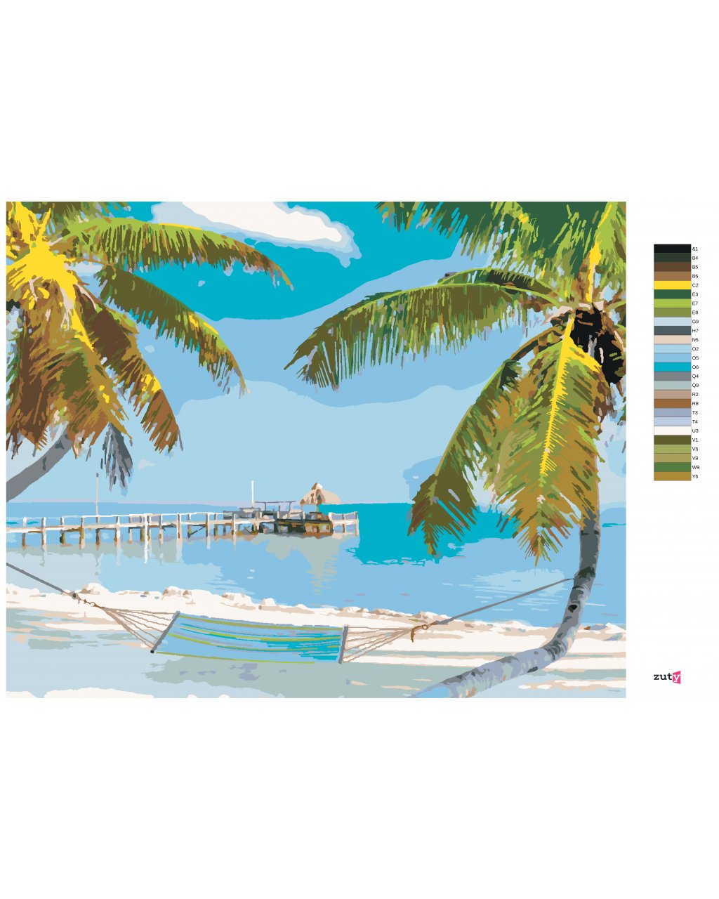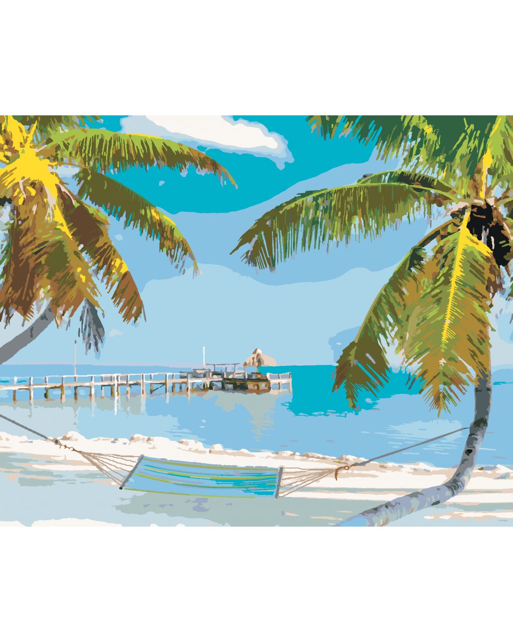 Maľovanie podľa čísel - PLÁŽ S HOJDAČKOU MEDZI PALMAMI (TED DAVIS)