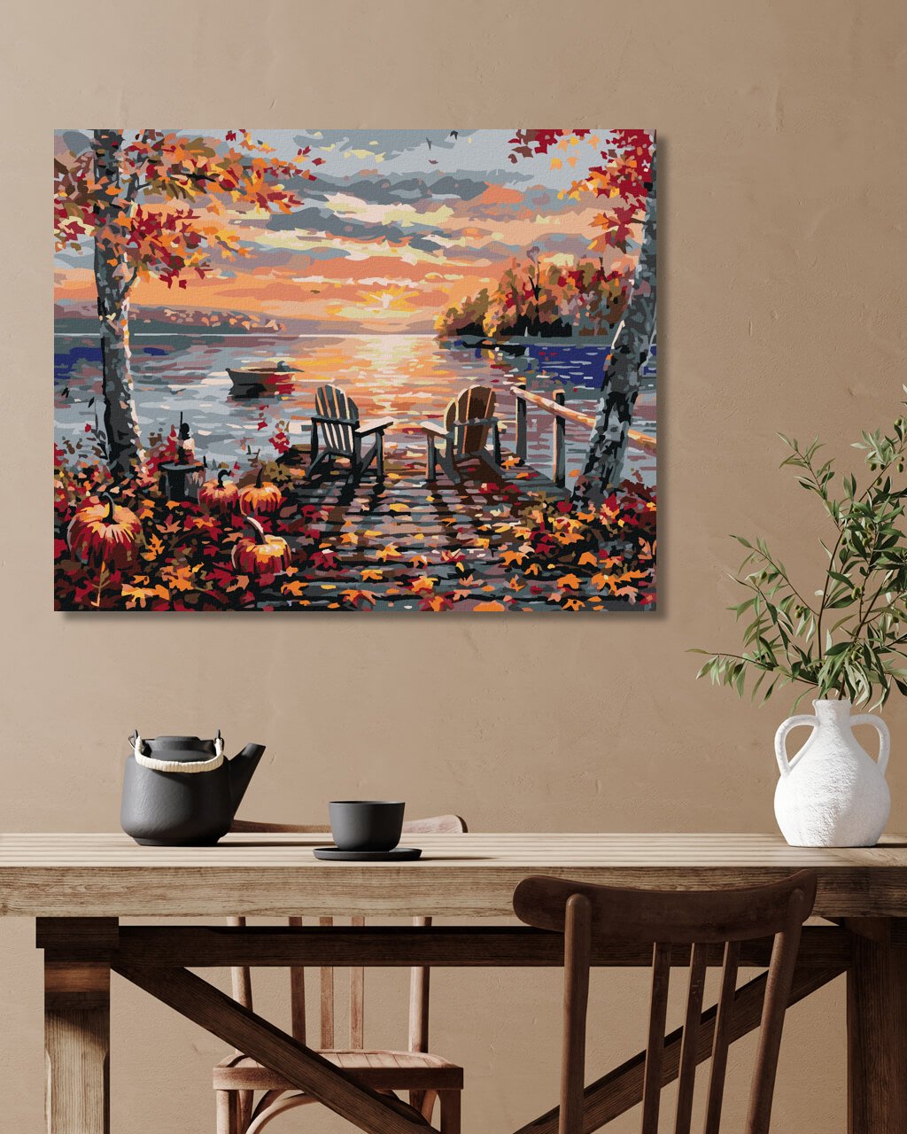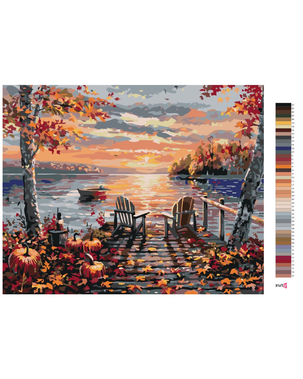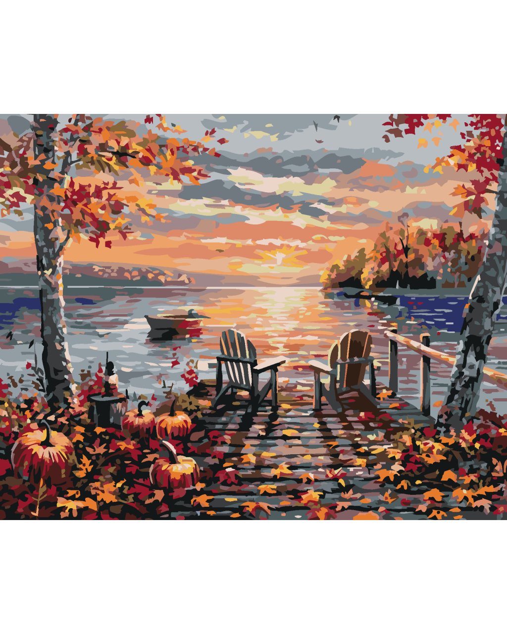 Maľovanie podľa čísel - POSEDENIE NA MÓLE, ČLN, JESENNÉ STROMY A ZÁPAD SLNKA