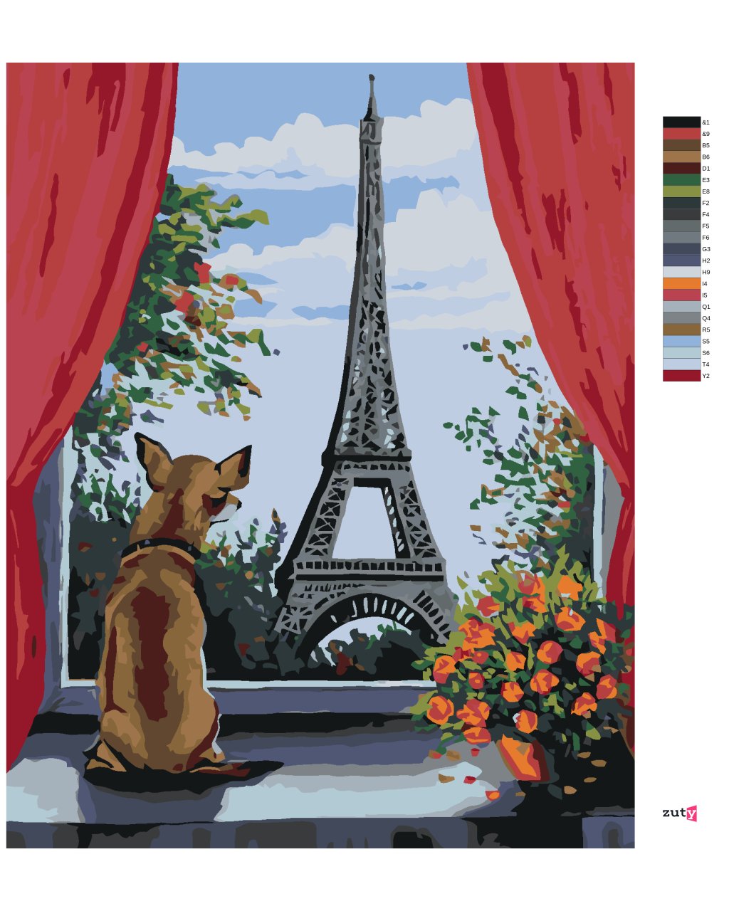Maľovanie podľa čísel - PSÍK V OKNE A VÝHĽADOM NA EIFFELOVKU