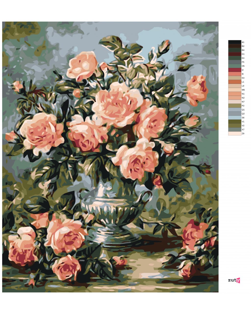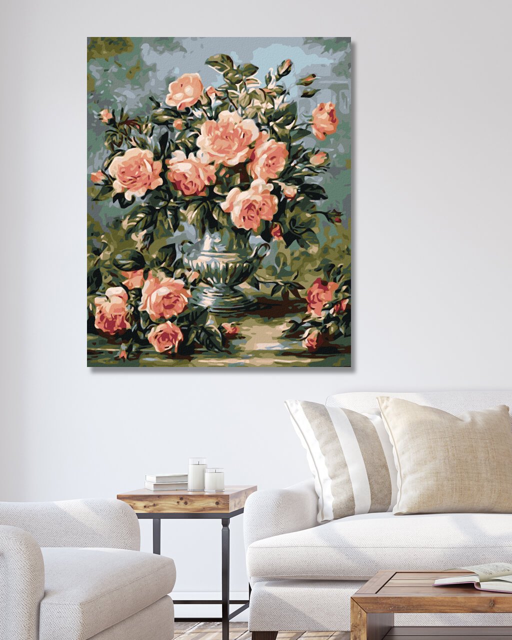 Maľovanie podľa čísel - RUŽOVÉ RUŽE V STRIEBORNEJ VÁZE
