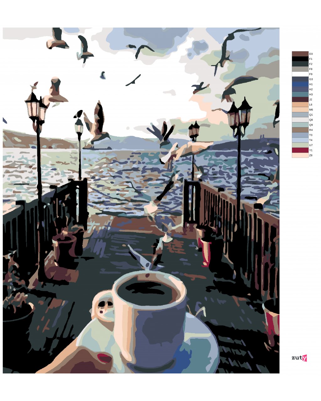 Maľovanie podľa čísel - ŠÁLOK KÁVY A ČAJKY NAD MOROM