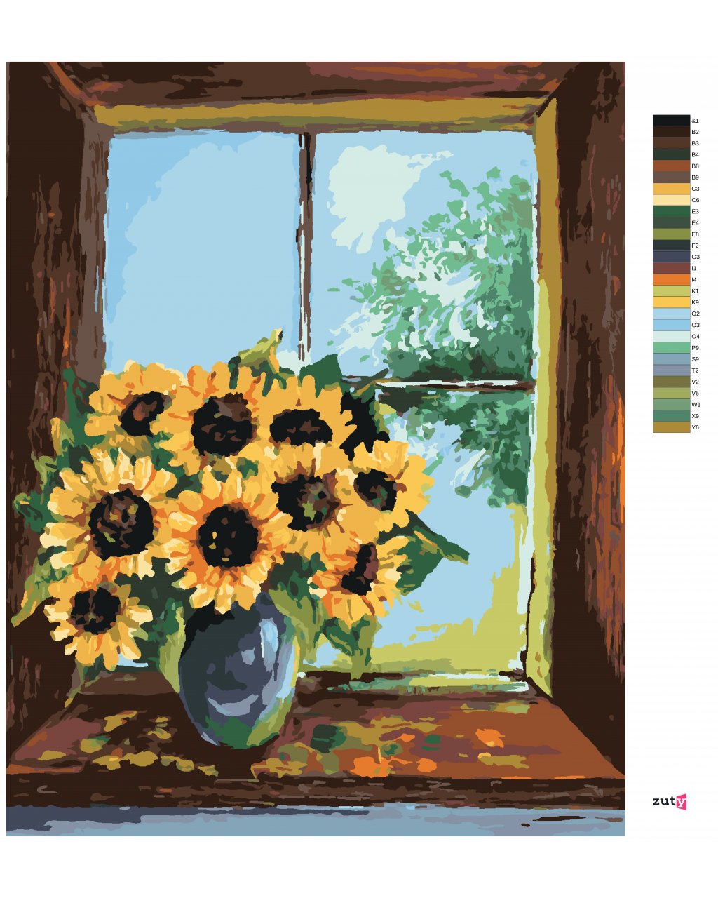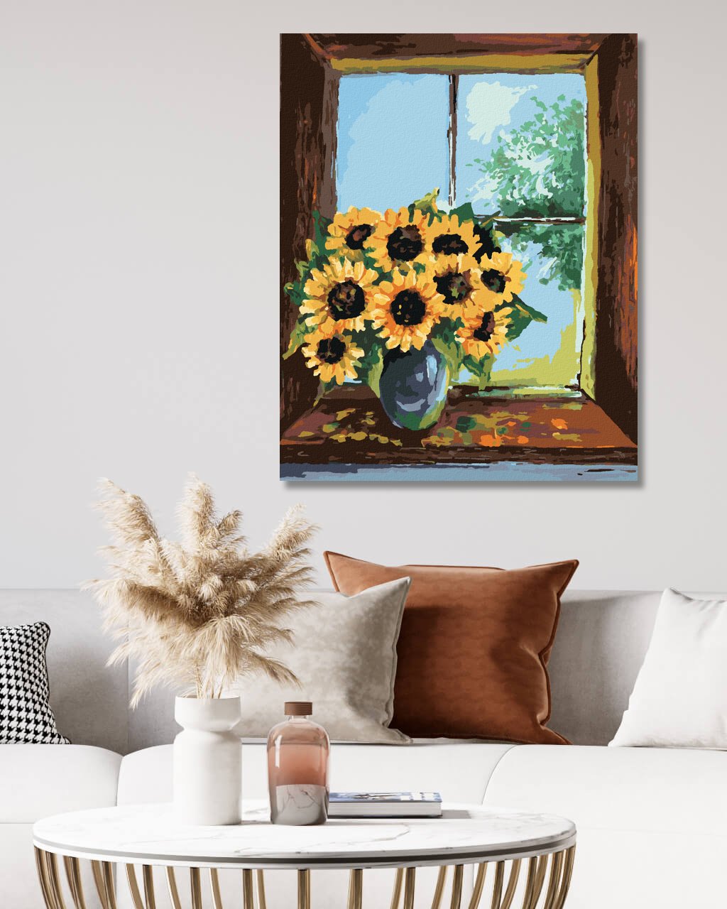 Maľovanie podľa čísel - SLNEČNICE VO VÁZE PRI OKNE