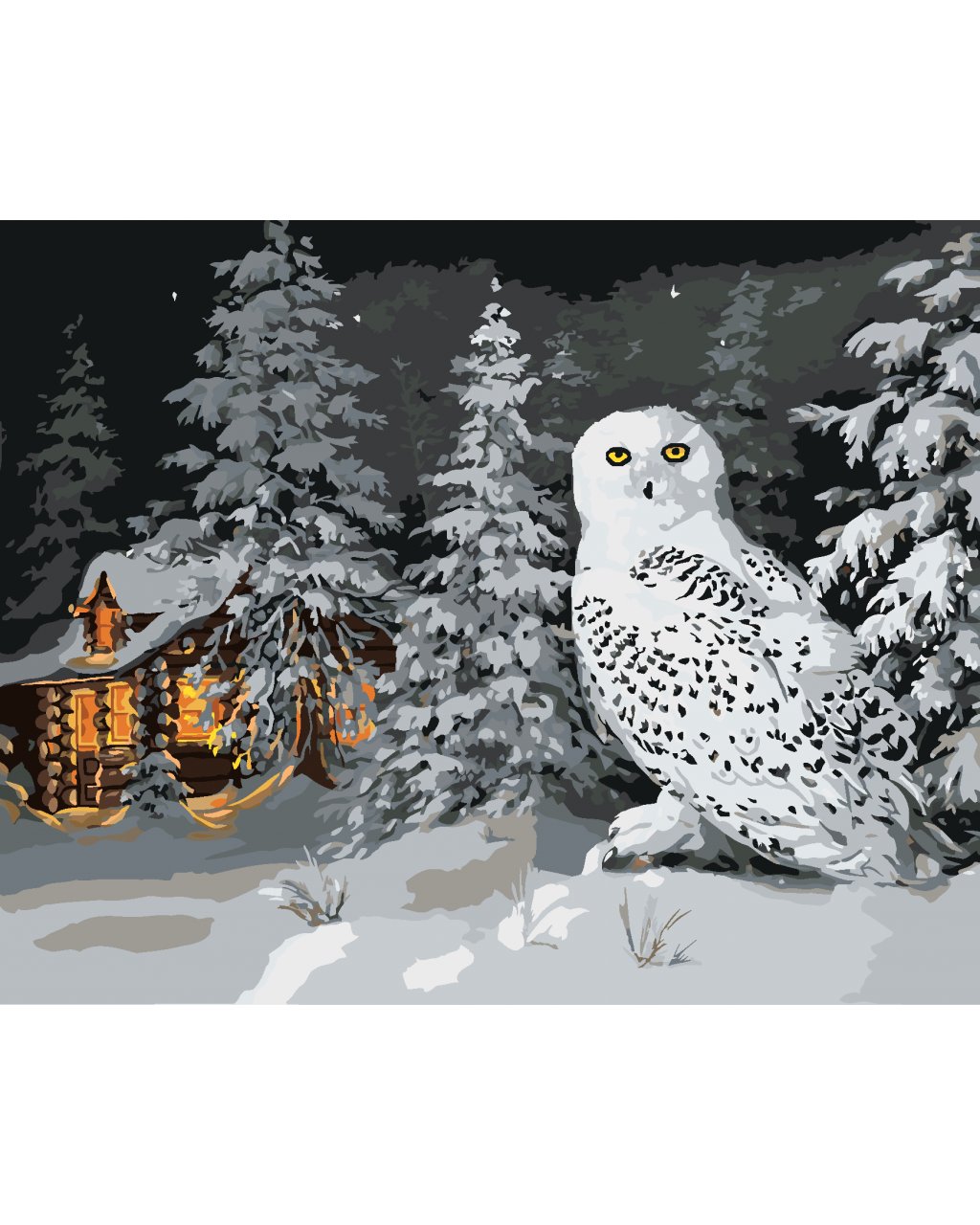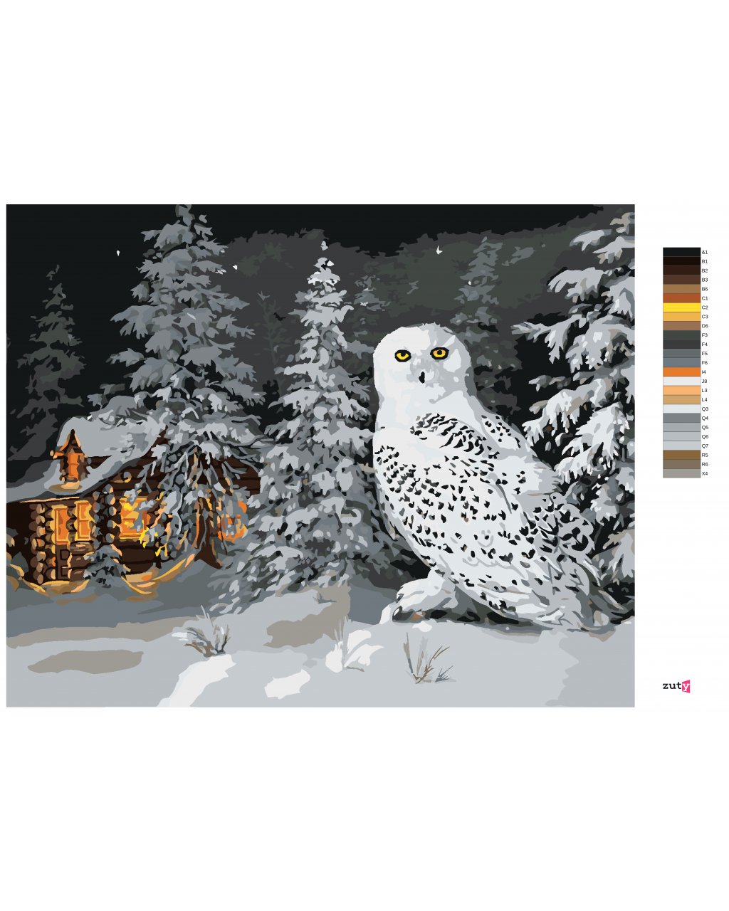 Maľovanie podľa čísel - SNEŽNÁ SOVA V LESE A CHATA V ZIME (D. RUSTY RUST)