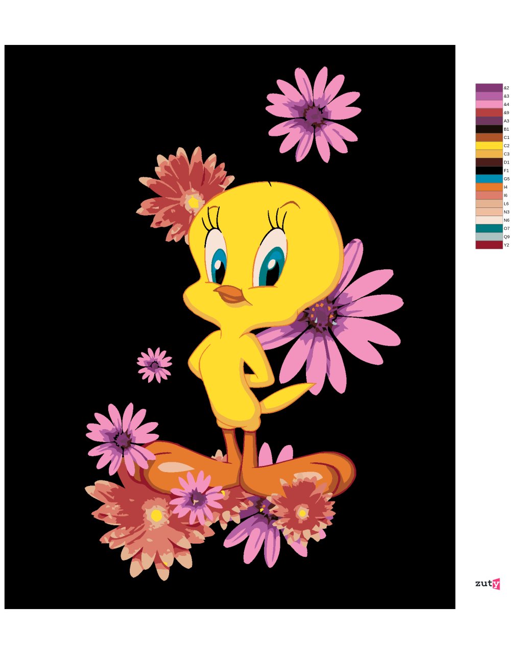 Maľovanie podľa čísel - TWEETY A RUŽOVÉ KVETY (LOONEY TUNES)
