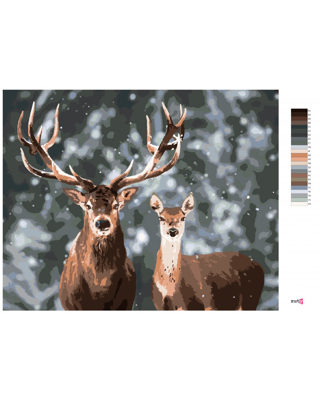 Maľovanie podľa čísel - UŠĽACHTILÝ JELEŇ A LAŇ V ZASNEŽENOM LESE
