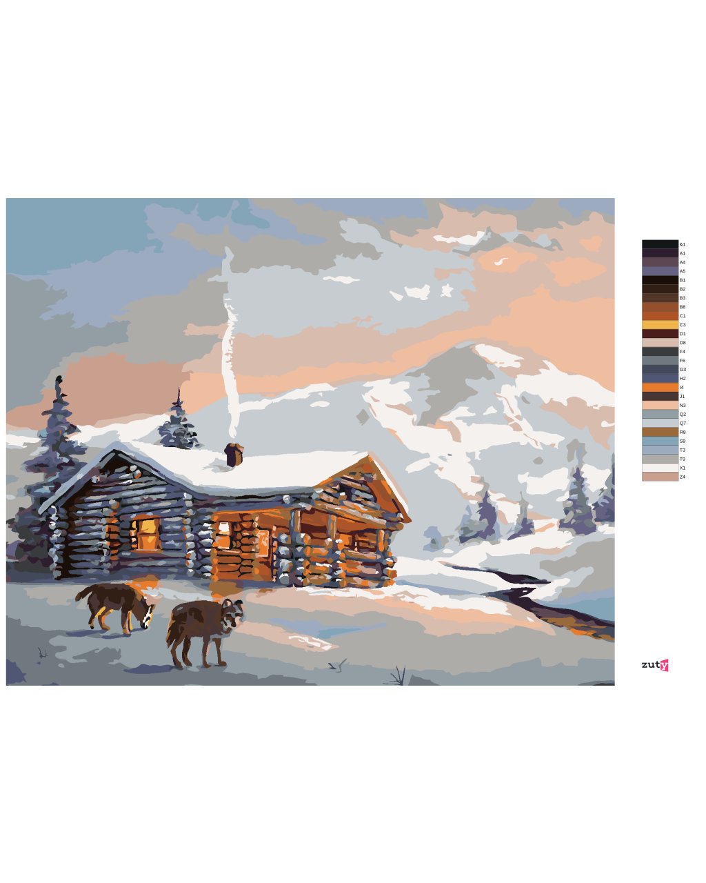 Maľovanie podľa čísel - VLCI A CHATA V ZIME (D. RUSTY RUST)