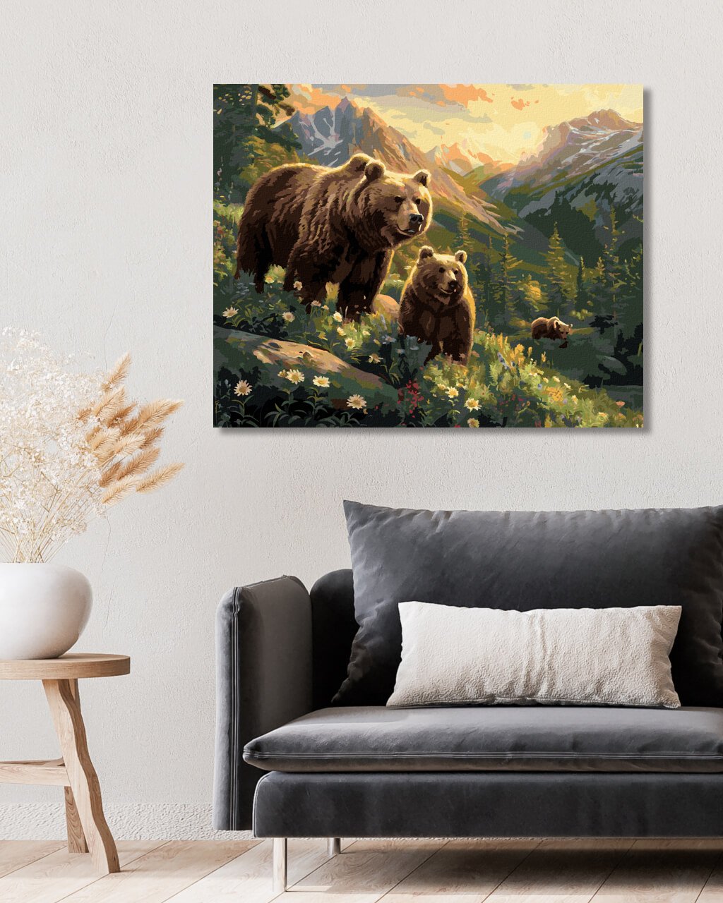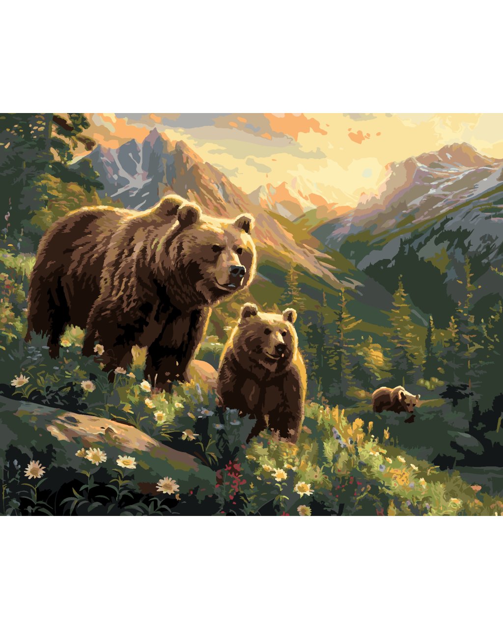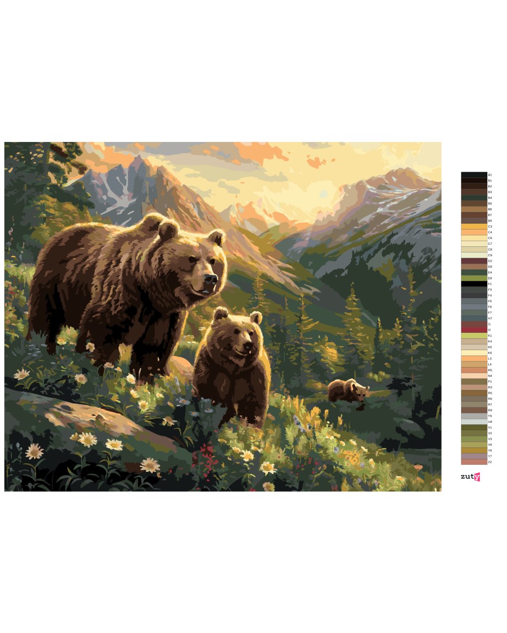 Maľovanie podľa čísel - ZÁPAD SLNKA, MEDVEĎ S MLÁĎATAMI A RIEKA MEDZI HORAMI