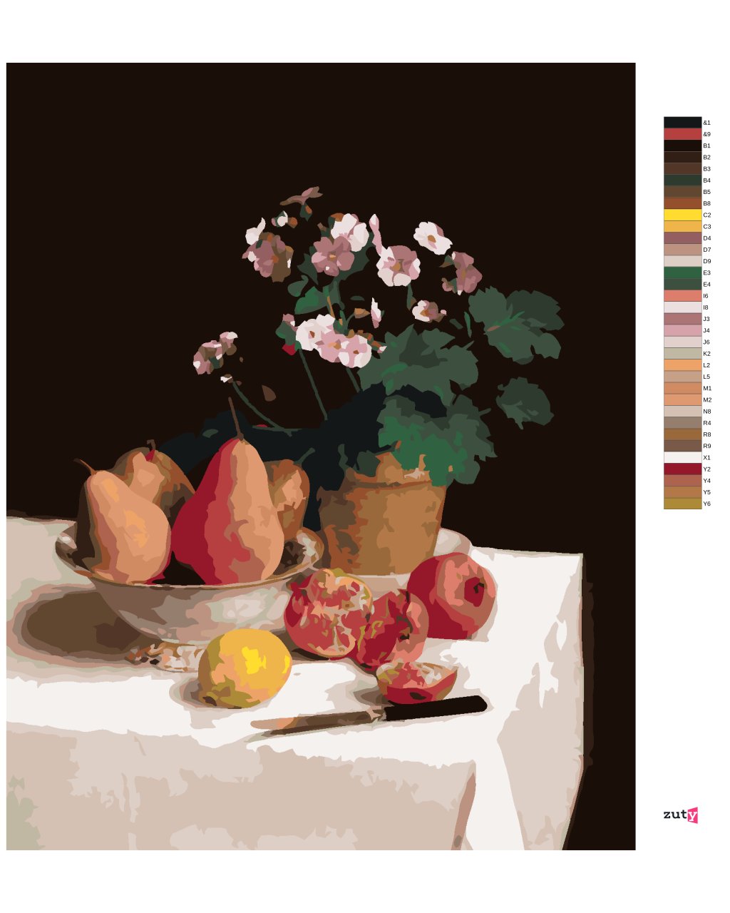 Maľovanie podľa čísel - ZÁTIŠIE, PRVOSIENKY, HRUŠKY A GRANÁTOVÉ JABLKÁ (HENRI FANTIN-LATOUR)