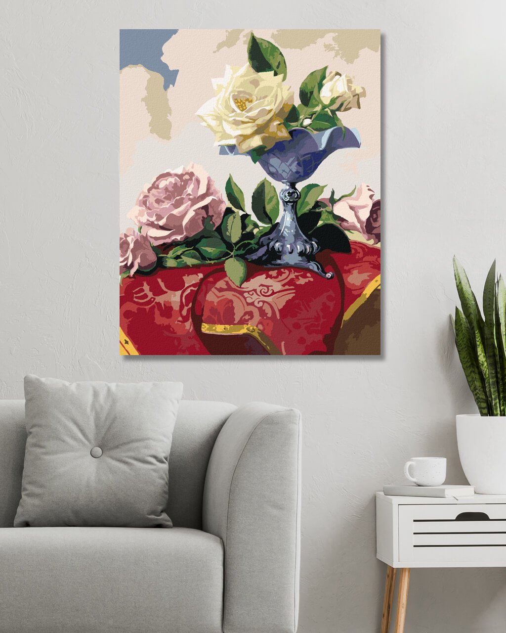 Maľovanie podľa čísel - ZÁTIŠIE BIELE A RUŽOVÉ RUŽE NA ČERVENOM OBRUSE (PIETER WAGEMANS)