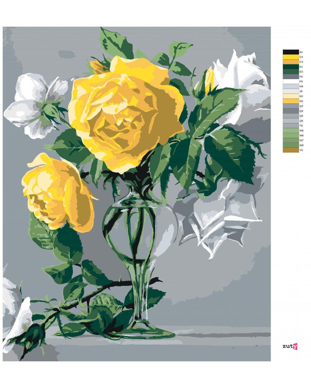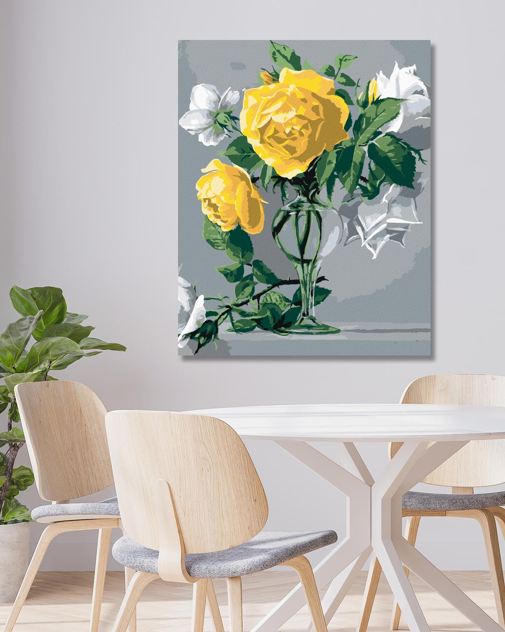 Maľovanie podľa čísel - ZÁTIŠIE BIELE A ŽLTÉ RUŽE V SKLENENEJ VÁZE (PIETER WAGEMANS)