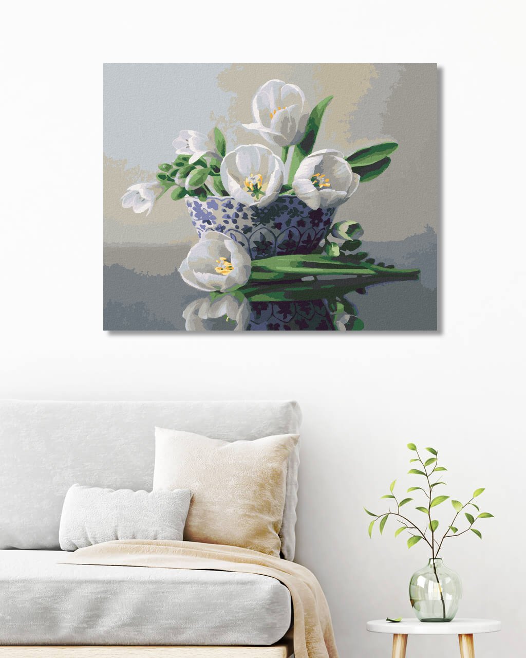 Maľovanie podľa čísel - ZÁTIŠIE BIELE TULIPÁNY V MODROBIELEJ MISE (PIETER WAGEMANS)