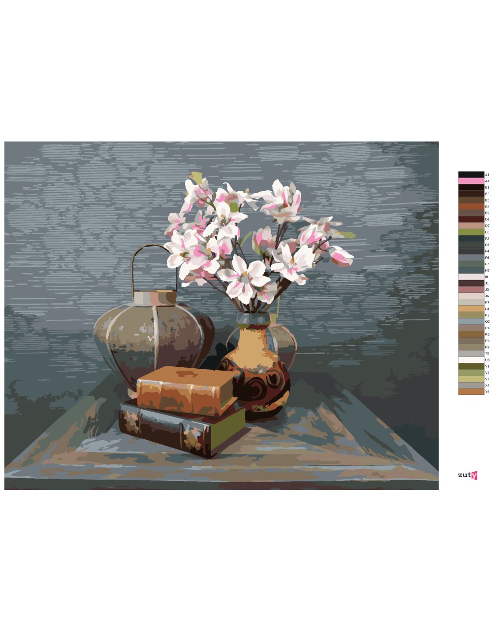 Maľovanie podľa čísel - ZÁTIŠIE MAGNÓLIA A STARÉ KNIHY NA STOLE