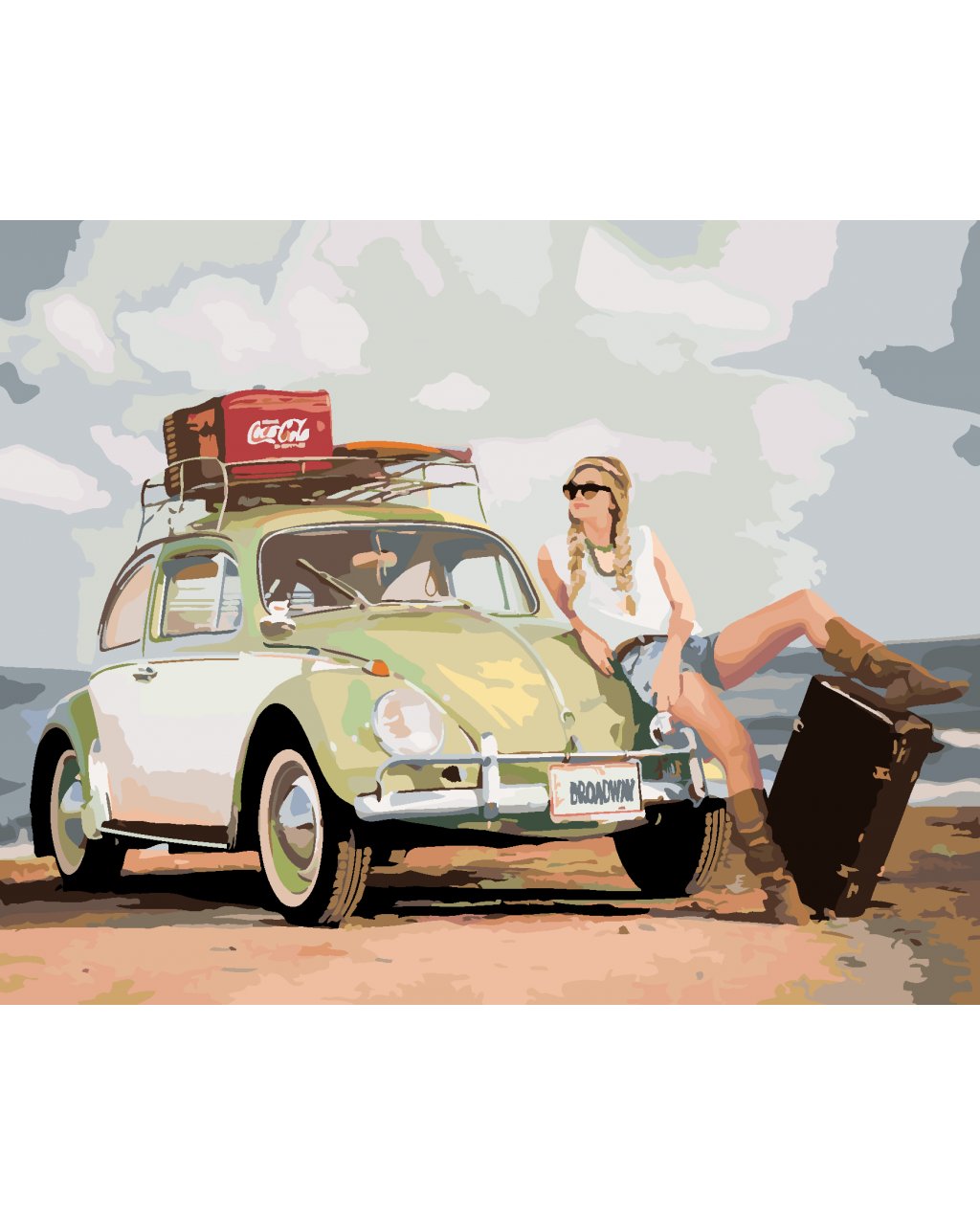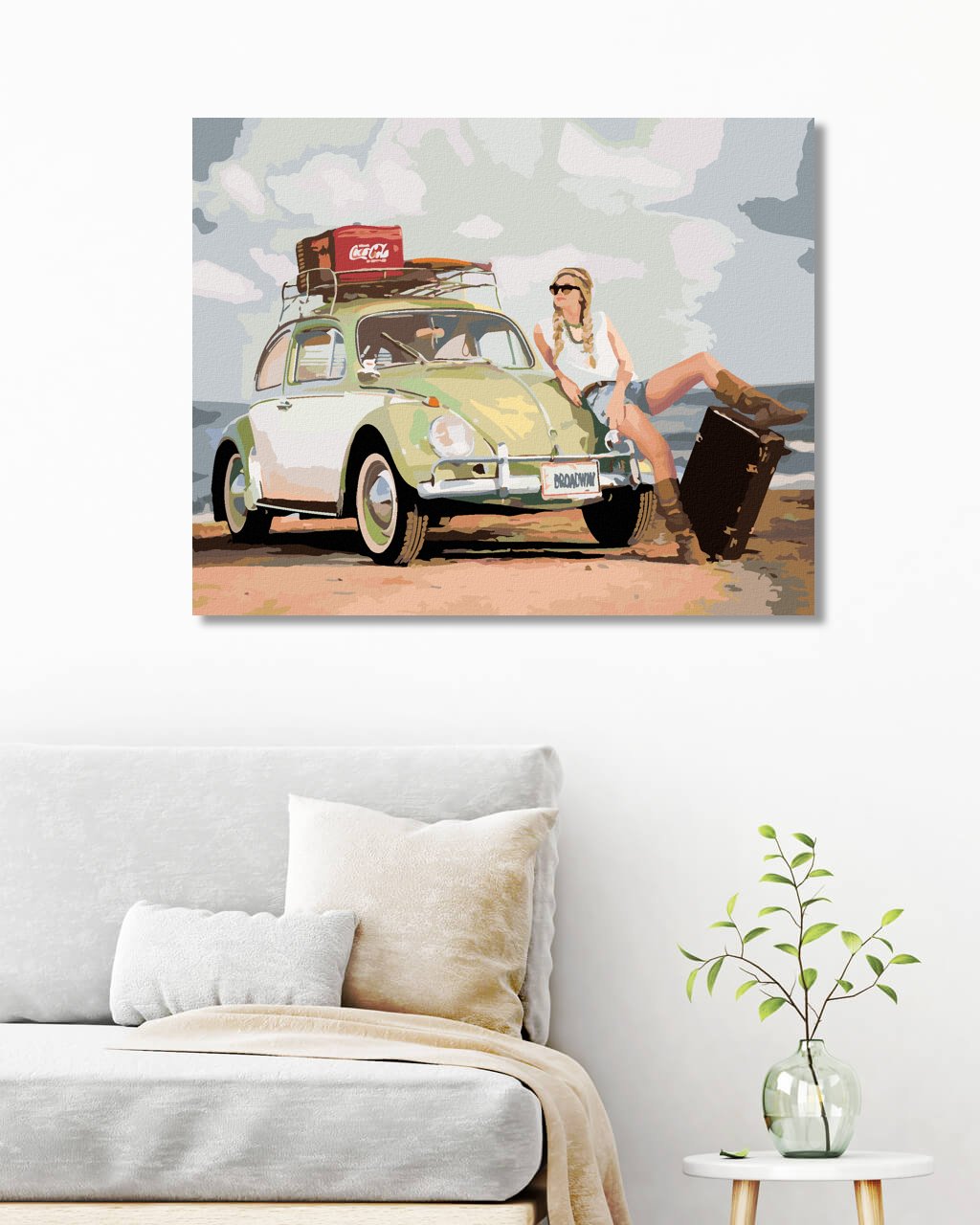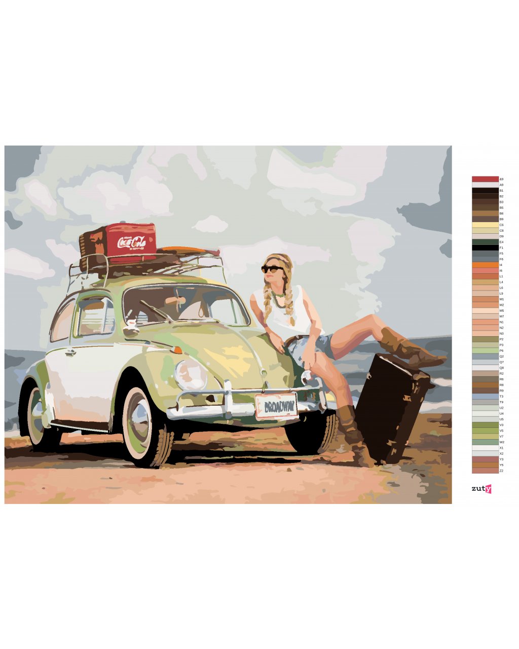 Maľovanie podľa čísel - ZELENÉ AUTO CHROBÁK A ŽENA S KUFROM