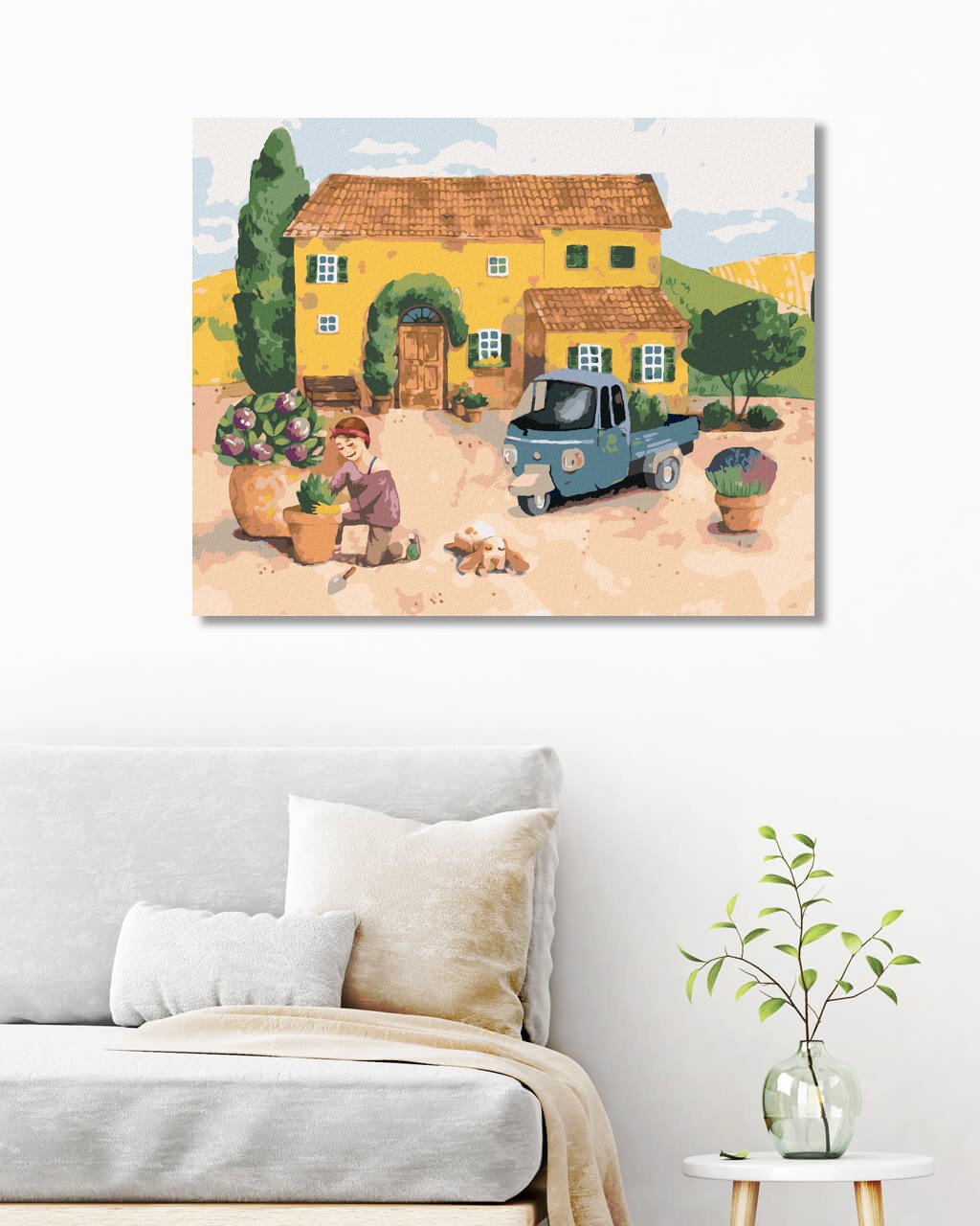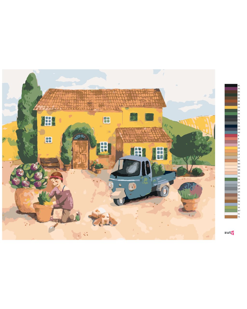 Maľovanie podľa čísel - ŽENA SADIACA KVETY PRI DOME V PROVANCE