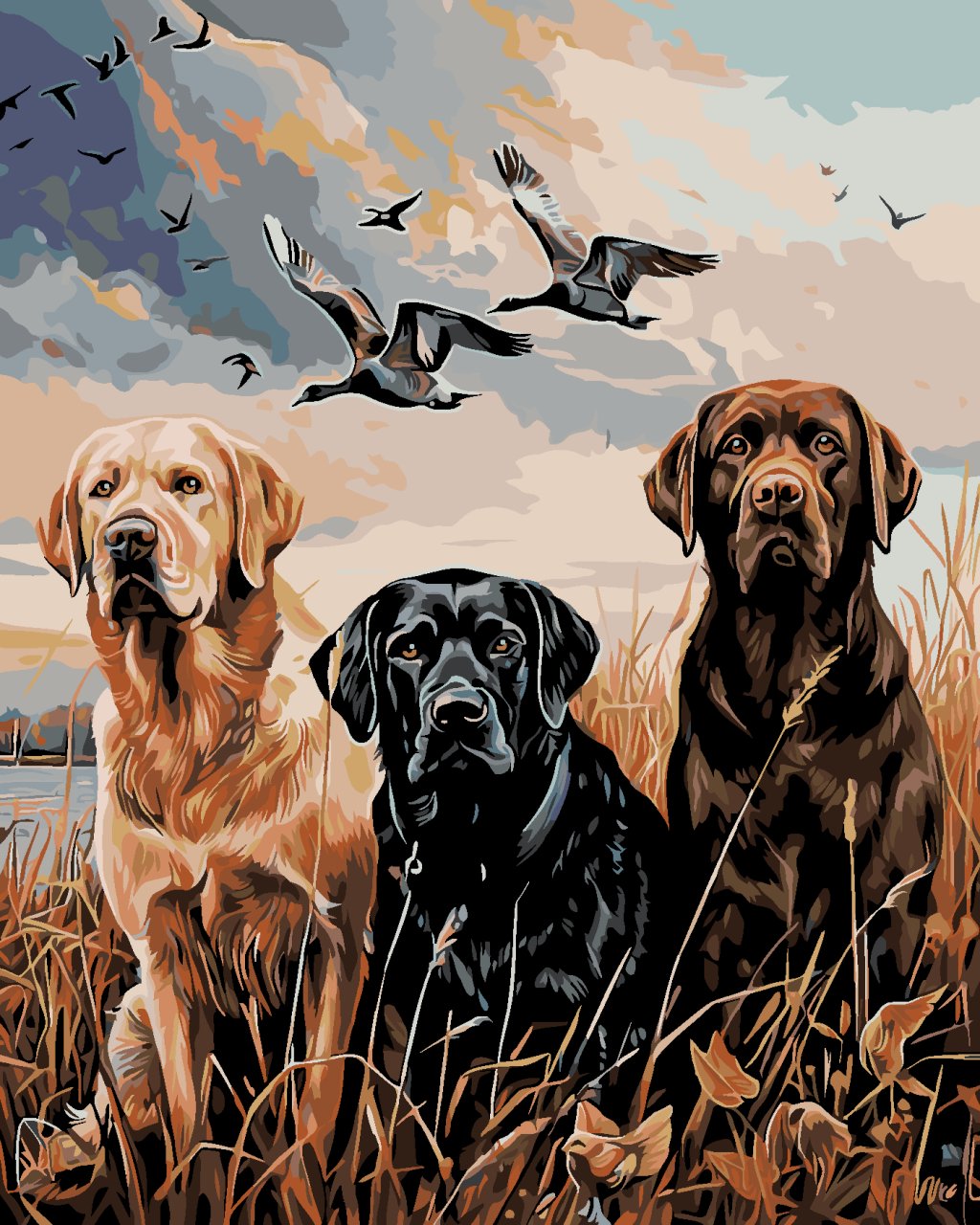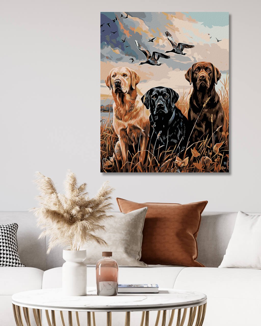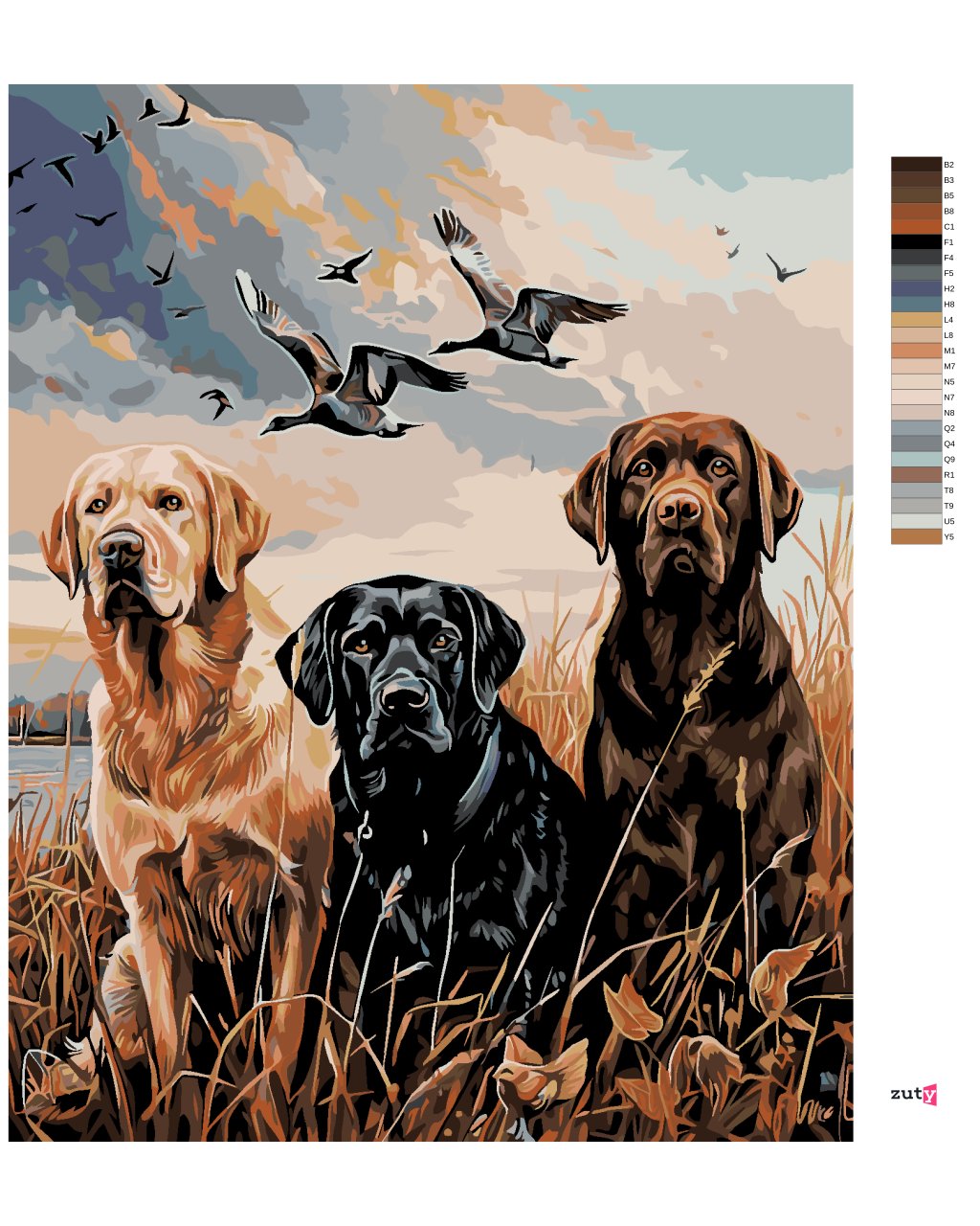 Maľovanie podľa čísel - ZLATÝ, HNEDÝ A ČIERNY LABRADOR V RAKOSÍ PRI RYBNÍKU