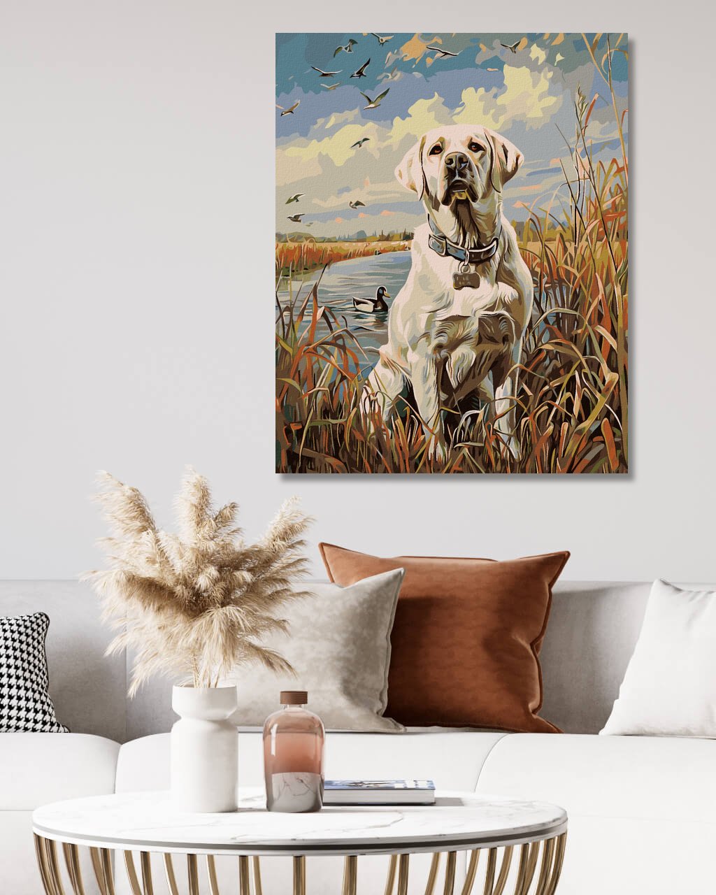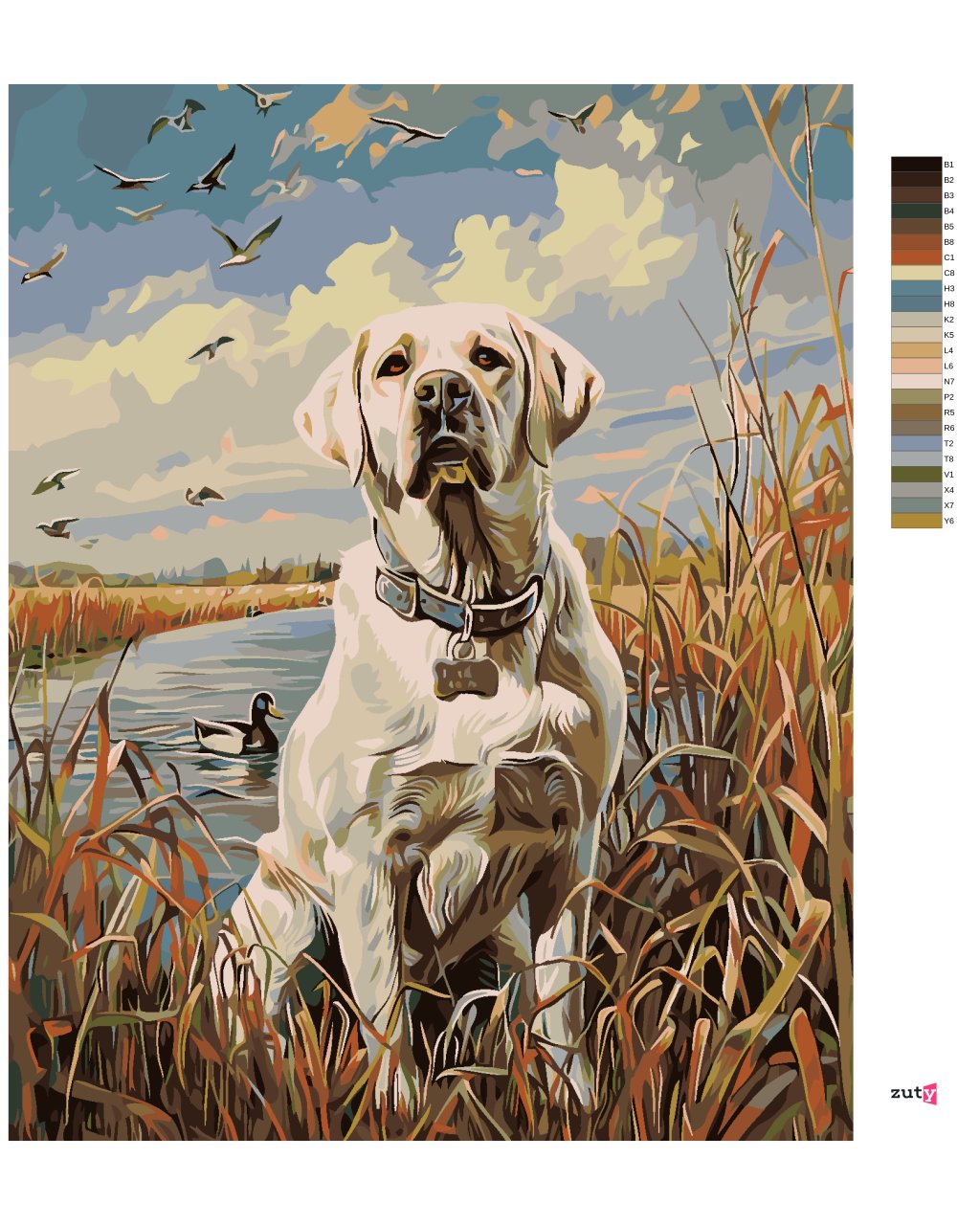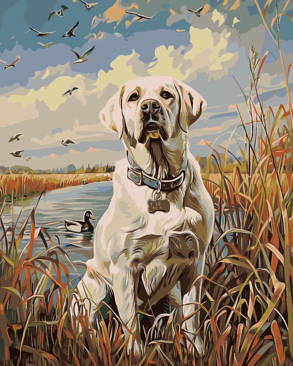 Maľovanie podľa čísel - ZLATÝ LABRADOR V RÁKOSÍ PRI RYBNÍKU A KAČKY