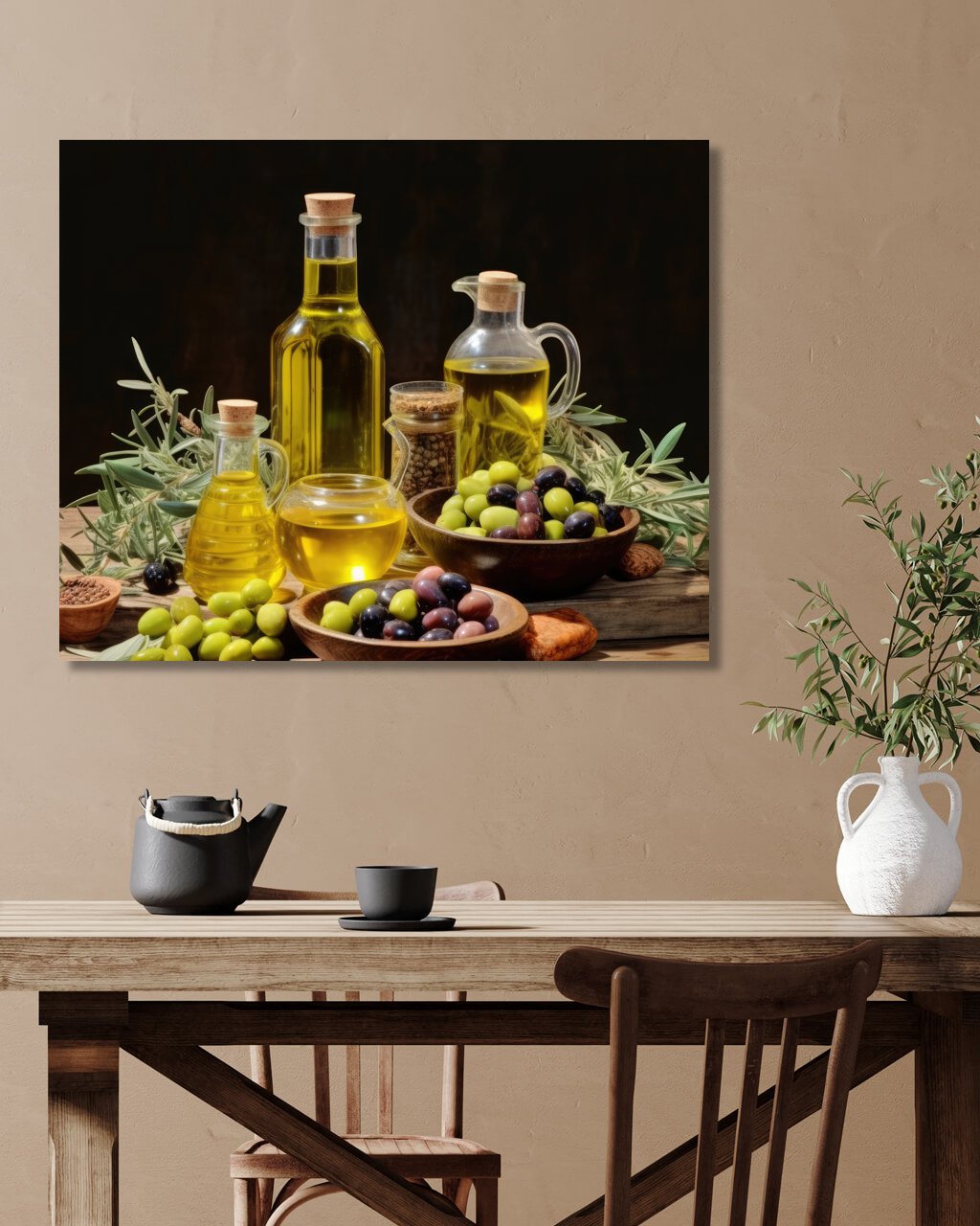 Obrazy na stenu - Aranžmán - olivový olej s olivami na stole
