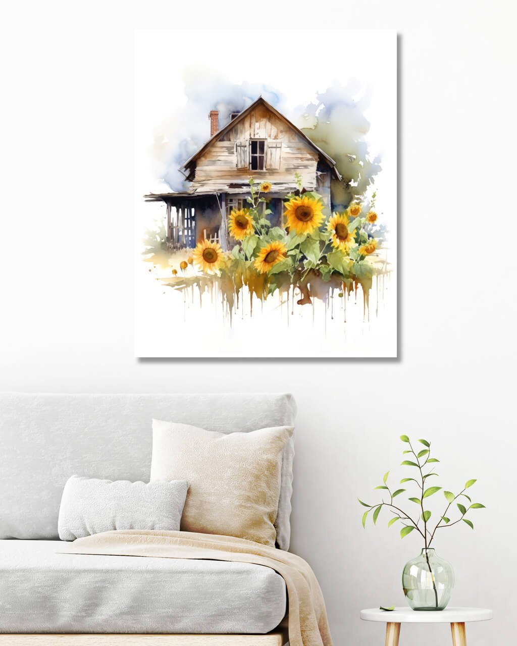Obrazy na stenu - Drevený domček so slnečnicovou záhradou