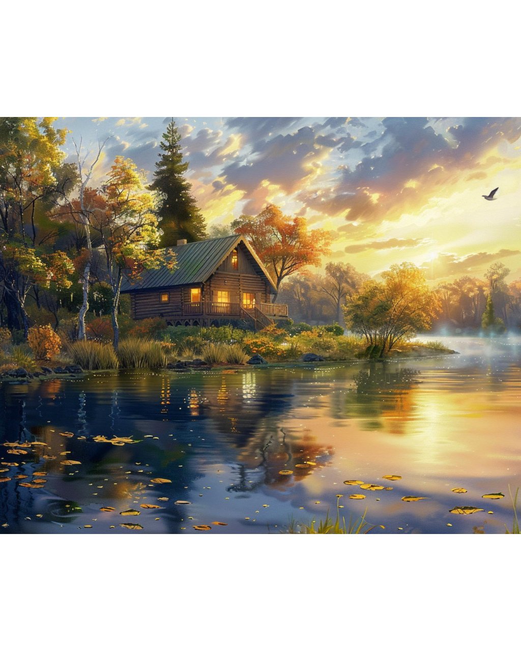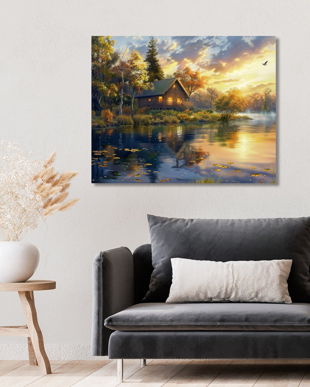 Obrazy na stenu - JAZERO, CHATA A ZÁPAD SLNKA