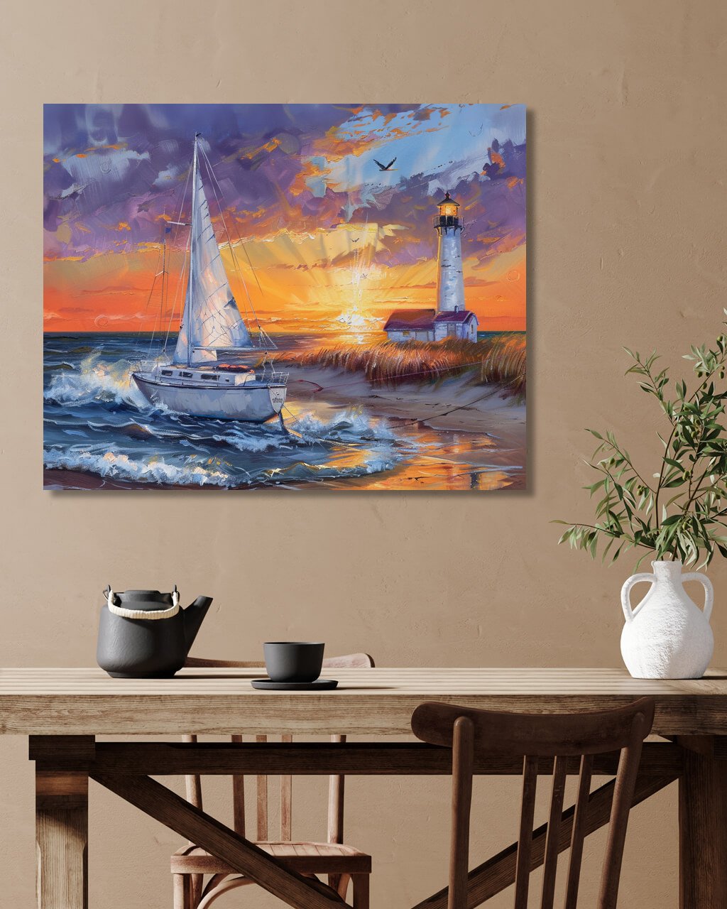 Obrazy na stenu - PLACHETNICA NA PLÁŽI, MAJÁK A ZÁPAD SLNKA