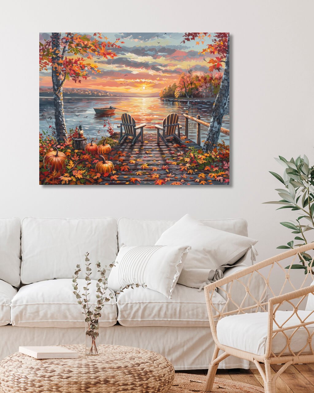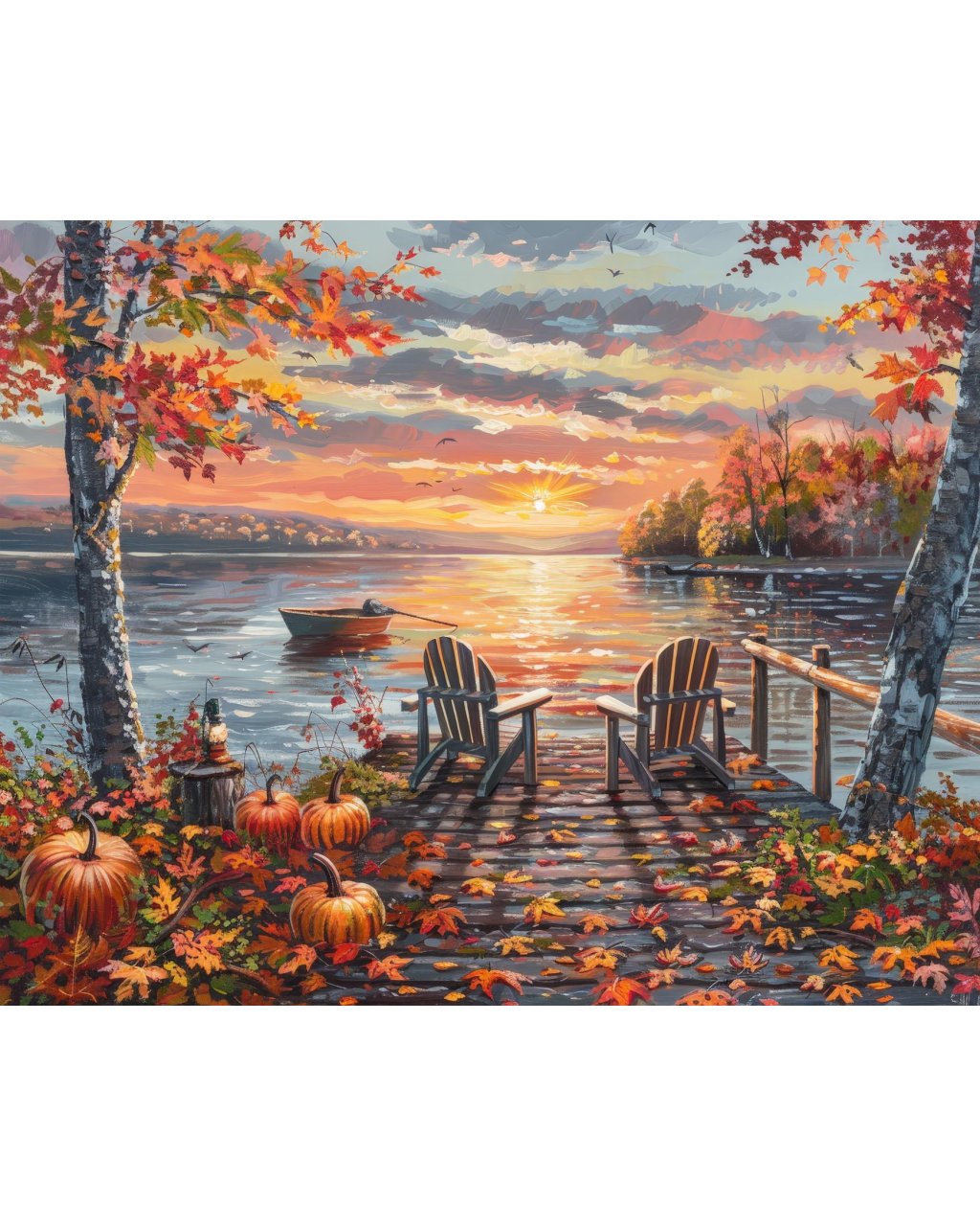 Obrazy na stenu - POSEDENIE NA MÓLE, ČLN, JESENNÉ STROMY A ZÁPAD SLNKA